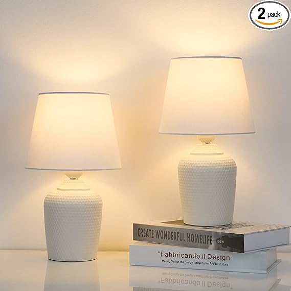 Small Table Lamps Set of 2, Bedside Nightstand Lamps for Bedroom Kid_Ñés Room, Cute Desk Lamps with Studded Texture Base for Reading Nursery Living Room Office, White