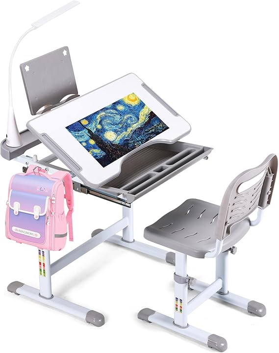 UNICOOëå Kids Study Table and Chair Set, Height Adjustable Kids Art Desk, Ergonomic Study Desk for Kids, w/LED Lamp, Tilt Desktop, Pull Out Drawer - Kids Table and Chairs, Toddler Table and Chair Set
