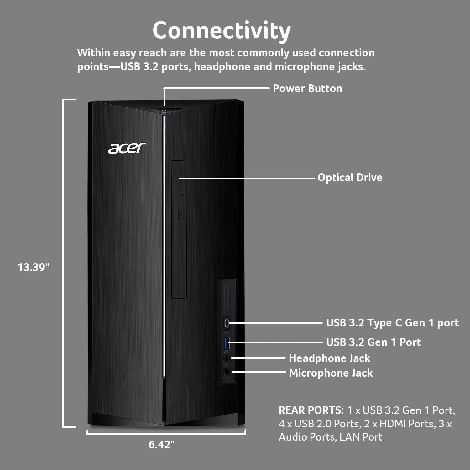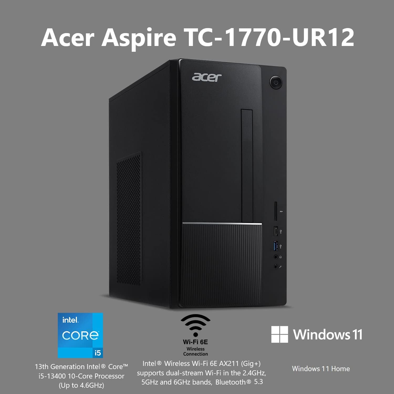 Acer Aspire TC-1760-UA92 Desktop PC comes with these specs: 12th Generation Intel Core i5-12400 6-Core Processor 2.5GHz with Performance-Core Max Turbo Frequency of up to 4.4GHz (18MB SmartCache), Windows 11 Home, 12GB DDR4 3200MHz RAM Memory, Intel UHD Graphics 730, 8x DVD Writer Double Layer Drive (DVD-RW), 512GB M.2 2280 NVMe SSD, High Def Audio with 5.1-Channel Surround Sound Support, 1 - USB 3.2 Type C Gen 1 port (up to 5 Gbps) (Front), 2 - USB 3.2 Gen 1 Ports (1 Front and 1 Rear), 4 - USB 2.0 Ports (Rear), 2 - HDMI Ports (Rear), Intel Wireless Wi-Fi 6 AX201 802.11ax Dual-Band 2.4GHz and 5GHz featuring 2x2 MU-MIMO technology, 10/100/1000 Gigabit Ethernet LAN (RJ 45 port), Bluetooth 5.2, 300W Power Supply, USB Keyboard and Mouse, 17.2 lbs. | 7.8 kg (system unit only), 1 Year Parts and Labor Limited Warranty with Toll Free Tech Support (DT.BHZAA.001).