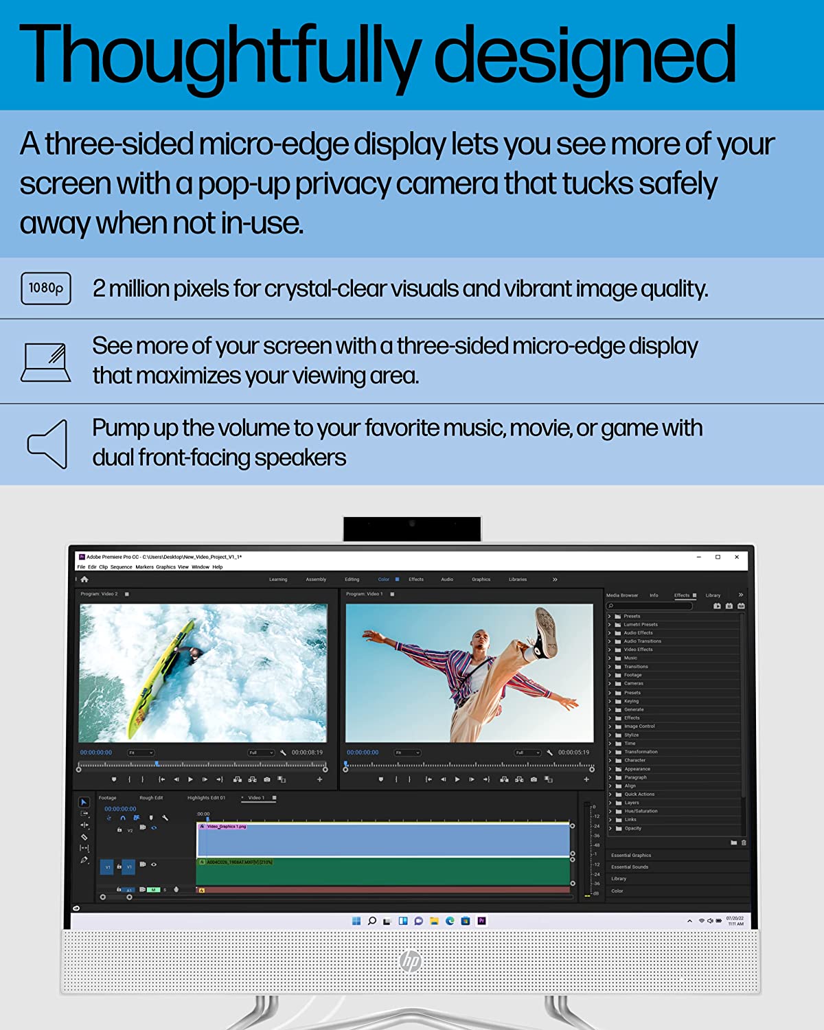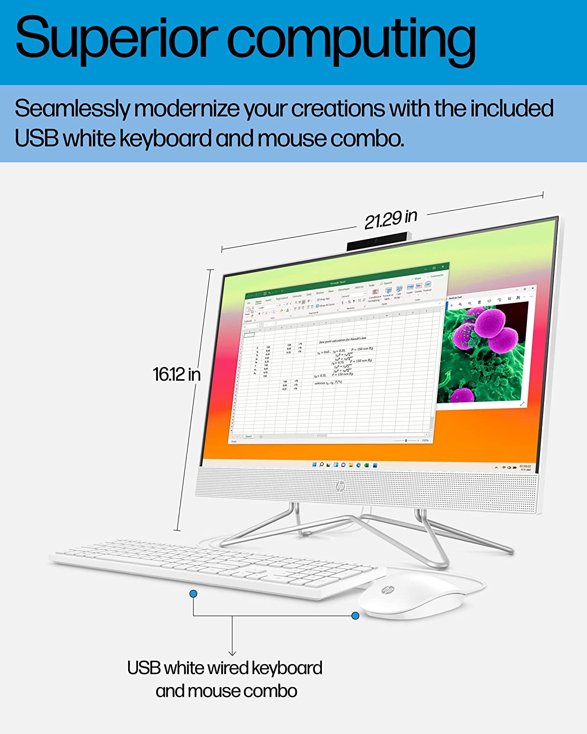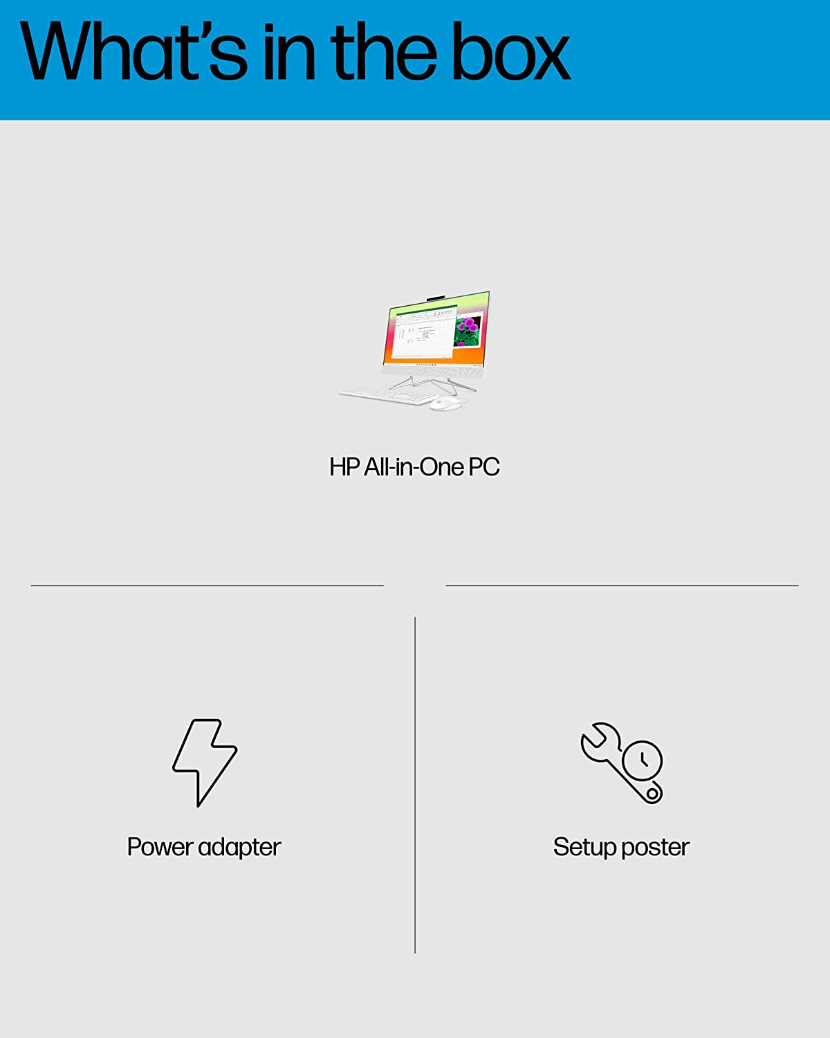 The HP All-in-One PC elevates your work, entertainment, and creations with its re-imagined Windows 11 OS (1) and super-fast AMD Ryzen 5 5625U Processor (2). Easily navigate through your work—right from the computer screen thanks to this 23.8-inch FHD display’s touchscreen (3) capabilities. With impressive AMD Radeon Graphics, your work, projects, and designs appear crisp. This HP All-in-One computer also lets you work more productively while keeping multiple tabs open without slowdown thanks to 12 GB DDR4-3200 MHz RAM (1 x 4 GB, 1 x 8 GB). Plus, 512 GB Intel PCIe NVMe SSD storage gives you tons of space for all your creations, documents, and projects. Backed by over 230 tests, your HP All-in-One desktop computer is built to last and provides durability you can trust for hard-core computing (4). Plus, this HP PC keeps your internet connection rock-solid using a Realtek Wi-Fi and Bluetooth 5 combo. With HP Wide Vision 1080p FHD IR privacy camera, each conversation feels up close and personal, while the included dual-array microphones allow you to mute and unmute when needed. What’s more, your privacy stays intact when the video chat ends thanks to the included privacy shutter. Create with the environment in mind; your HP All-in-One PC is sustainable, efficient, EPEAT registered, and ENERGY STAR certified.