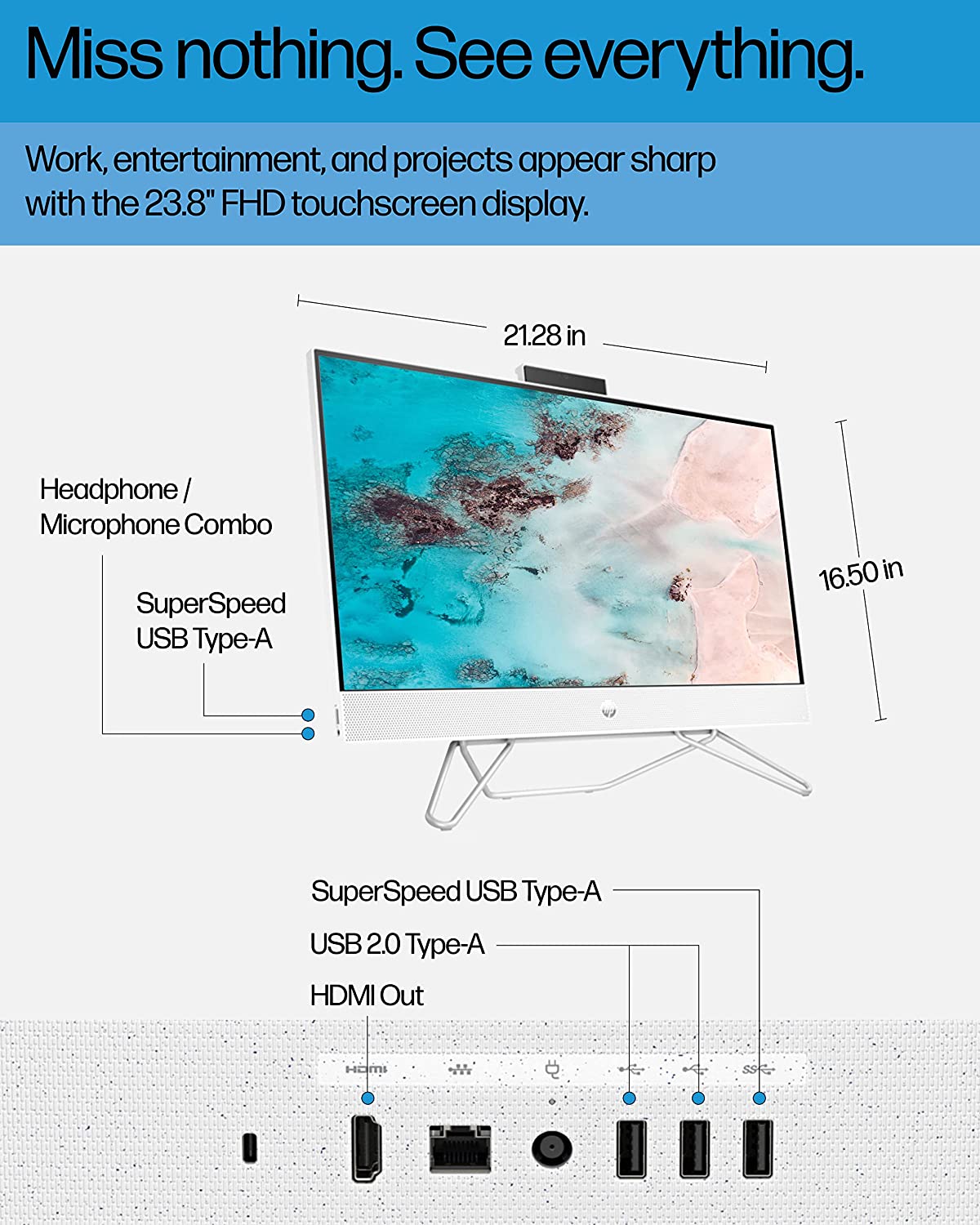 HP All-in-One PC, 23.8" FHD Micro-Edge Touchscreen Display, AMD Ryzen 5 Processor, AMD Radeon Graphics, 12 GB RAM, 512 GB SSD, Windows 11 Home OS, Wi-Fi (24-cb1142, 2022)