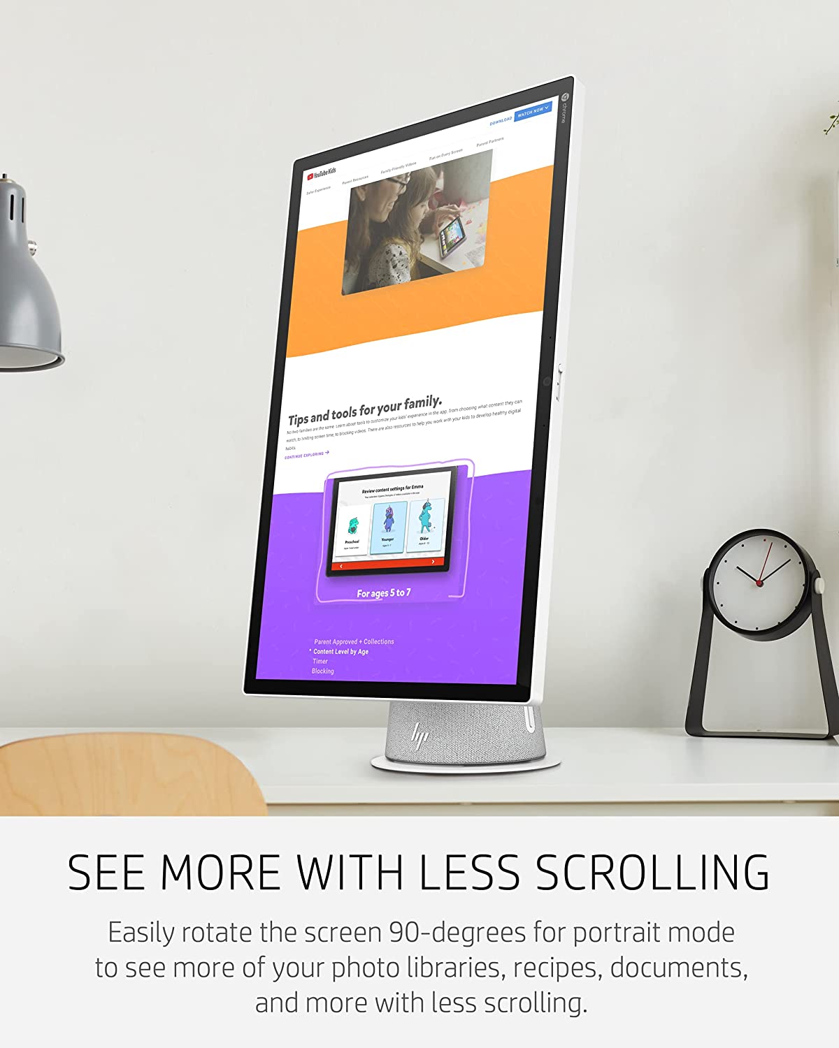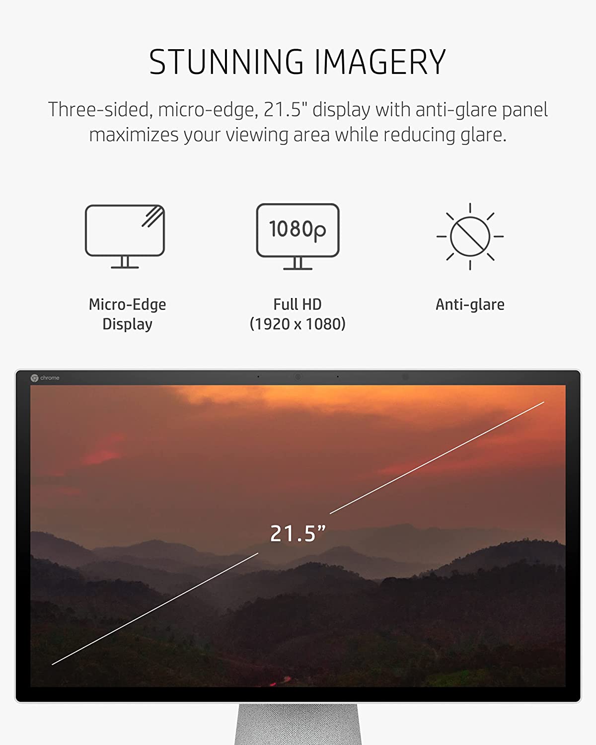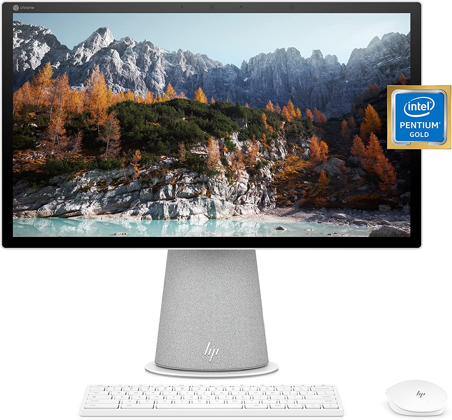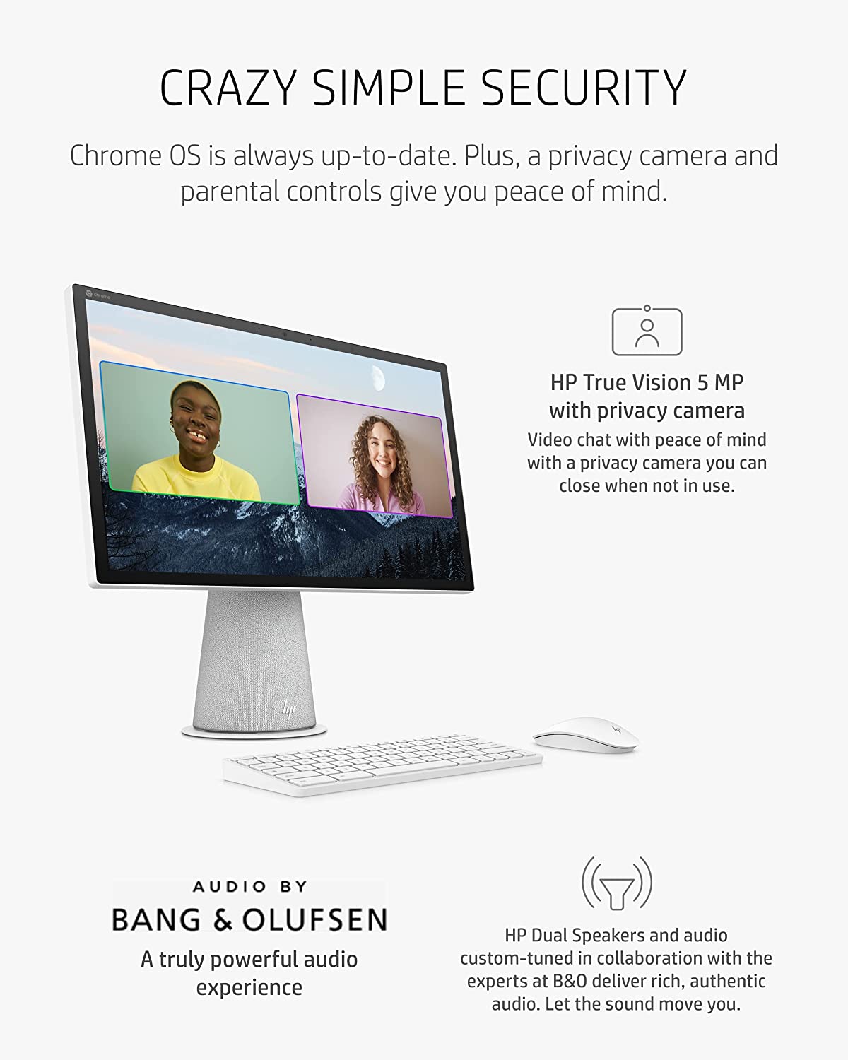 Change your perspective on home PCs with the HP Chromebase 21.5" All-in-One Desktop. From students to breadwinners, the whole family can make the most of the rotating, 21.5 inch Full HD screen (1). Whether you’re working on a project or looking for a hot new movie to stream, your HP computer monitor has been streamlined for simplicity: control your device hands-free with Google Assistant voice commands (2), conveniently find files or apps with the keyboard’s Everything Button, and swap between portrait or landscape mode seamlessly. Enjoy smooth computing with the Intel Pentium Gold 6405U processor and Intel UHD Graphics powering this super-reliable all-in-one computer (3) (4). Beyond being merely rotatable, your computer screen is 10-point touch-enabled, offers 178-degree wide-viewing angles, and sports a three-sided micro-edge bezel; it's simultaneously the perfect interface and an immersive display. Plus, your touchscreen monitor’s anti-glare panel means you’ll get less glare even in direct sunlight. Work the way you like–unabated, efficient, and fast thanks to your HP monitor’s 4 GB of RAM (5). The whole family can store their important school or work docs comfortably with 128 GB of PCIe NVMe M.2 Solid State Drive storage (6) (7). Connect or power your secondary devices and displays as this All-in-One desktop computer boasts 2 USB Type-A and 2 USB Type-C ports (8) (9). Not only can your whole household compute the way they want, but they’ll stay safe while doing it courtesy of the always-secure Chrome operating system (2). Confidence in this desktop monitor goes beyond online security into its very design with a 1-year limited hardware warranty to support your purchase. Enjoy reliable connectivity while on a conference call, joining an online class, or streaming your favorite show with a Wi-Fi CERTIFIED 6 (2x2) and Bluetooth 5 combo (10) (11) (12). Your HP desktop computer comes complete with every accessory you could need from launch: the HP 910 white Bluetooth keyboard and mouse combo (11), the integrated HP True Vision 5 MP privacy camera (13), and built-in custom-tuned HP Dual Speakers. This desktop monitor covers every business, school, or entertainment facet you could need and does it all responsibly. Get the most out of the sustainably designed HP Chromebase 21.5" All-in-One Desktop that is both ENERGY STAR certified (14) and EPEAT Silver registered (15). (1) Full High Definition (FHD) content is required to view FHD images. (2) For more information, visit google.com/chromebook/chrome-os/ (3) Multi-core is designed to improve the performance of certain software products. Not all customers or software applications will necessarily benefit from the use of this technology. Performance and clock frequency will vary depending on application workload and your hardware and software configurations. Intel’s numbering, branding, and/or naming is not a measurement of higher performance. Intel, Pentium, Intel Core, Celeron, Intel logo, and the Intel Inside logo are trademarks of Intel Corporation in the U.S. and other countries. (4) Part of the total system memory (RAM) is used for graphics/video performance. System memory dedicated to graphics/video performance is not available for other use by other programs. (5) Up to 512MB of main system memory may be allocated to support video graphics. (6) Actual formatted capacity is less. Portion of internal storage is reserved for preloaded content. (7) Based on HP internal testing using CrystalDiskMark benchmarking software. Performance is sequentially faster (read only) compared to traditional 5,400 rpm HDD. (8) Actual throughput may vary. (9) USB Type-C and USB-C are trademarks of USB Implementers Forum. (10) Wireless access point and internet service required and sold separately. The availability of public wireless access points is limited. Wi-Fi CERTIFIED 6TM (802.11ax) is backwards compatible with prior 802.11 specs. Wi-Fi CERTIFIED 6TM is designed to support gigabit data rate when transferring files between two devices connected to the same router. Requires a wireless router, sold separately, that supports 80MHz and higher channels. Only available in countries where 802.11ax is supported. (11) Bluetooth is a trademark owned by its proprietor and used by Hewlett-Packard Company under license. (12) Based on Wi-Fi 5 80MHz and Wi-Fi 6 160MHz minimum requirements when transferring files between two devices connected to the same router. Requires a wireless router, sold separately, that supports 802.11ax (Wi-Fi 6). Only available in countries where 802.11ax is supported. (20) All performance specifications represent the typical specifications provided by HP's component manufacturers; actual performance may vary either higher or lower. (13) Features may require software or other 3rd party applications to provide the described functionality. Internet service required and not included. (14) ENERGY STAR and the ENERGY STAR mark are registered trademarks owned by the U.S. Environmental Protection Agency. (15) Based on U.S. EPEAT® registration according to IEEE 1680.1-2018 EPEAT®. EPEAT® status varies by country.