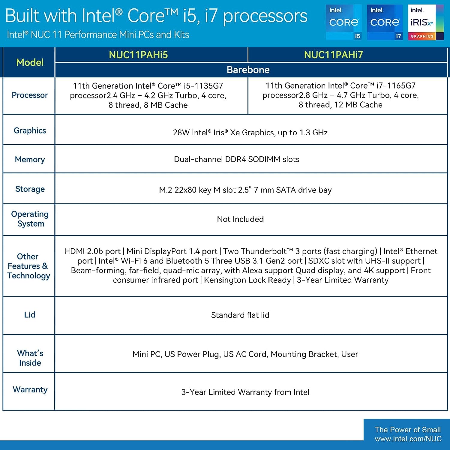 • 【Feature-Rich Ports】-- The Intel NUC 11 Mini PC is equipped with 3 * USB 3.1 Gen2, 2 * Thunderbolt 3, 1 * HDMI, 1 * MiniDP, 1 * Intel Ethernet port, 1 * 3.5mm Audio jack, 1 * SDXC slot with UHS-II, and 1 * DC jack, allowing it to be connected to a wide range of peripherals such as keyboards, mice, speakers, headsets, servers, surveillance equipment, office equipment, monitors, projectors, TVs, and more, providing easy solutions for office businesses, home audio and video needs.