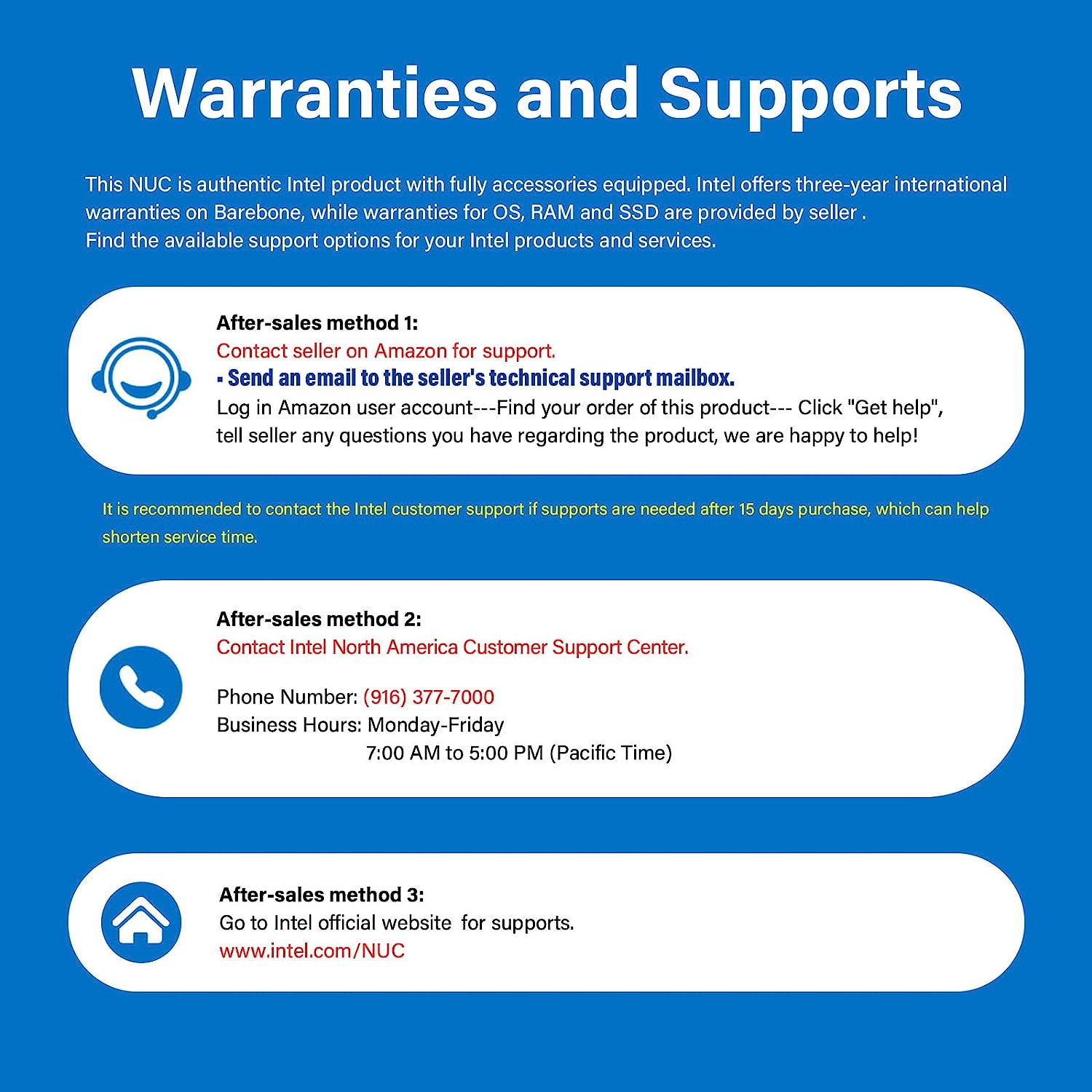 • 【3-Year Global Warranty from Intel NUC】-- Enjoy the wonderful shopping experience with us! All products sold from us are backed by a 3-Year Warranty Service from Intel. Should you encounter any issues with the NUC Barebone part, you can either head to the local Intel NUC offline after-sales store or contact us for assistance. As a friendly reminder, please remove the Memory and SSD before returning to the aftermarket. NENCHIN offers a 3-year warranty on RAM, SSD, and OS!