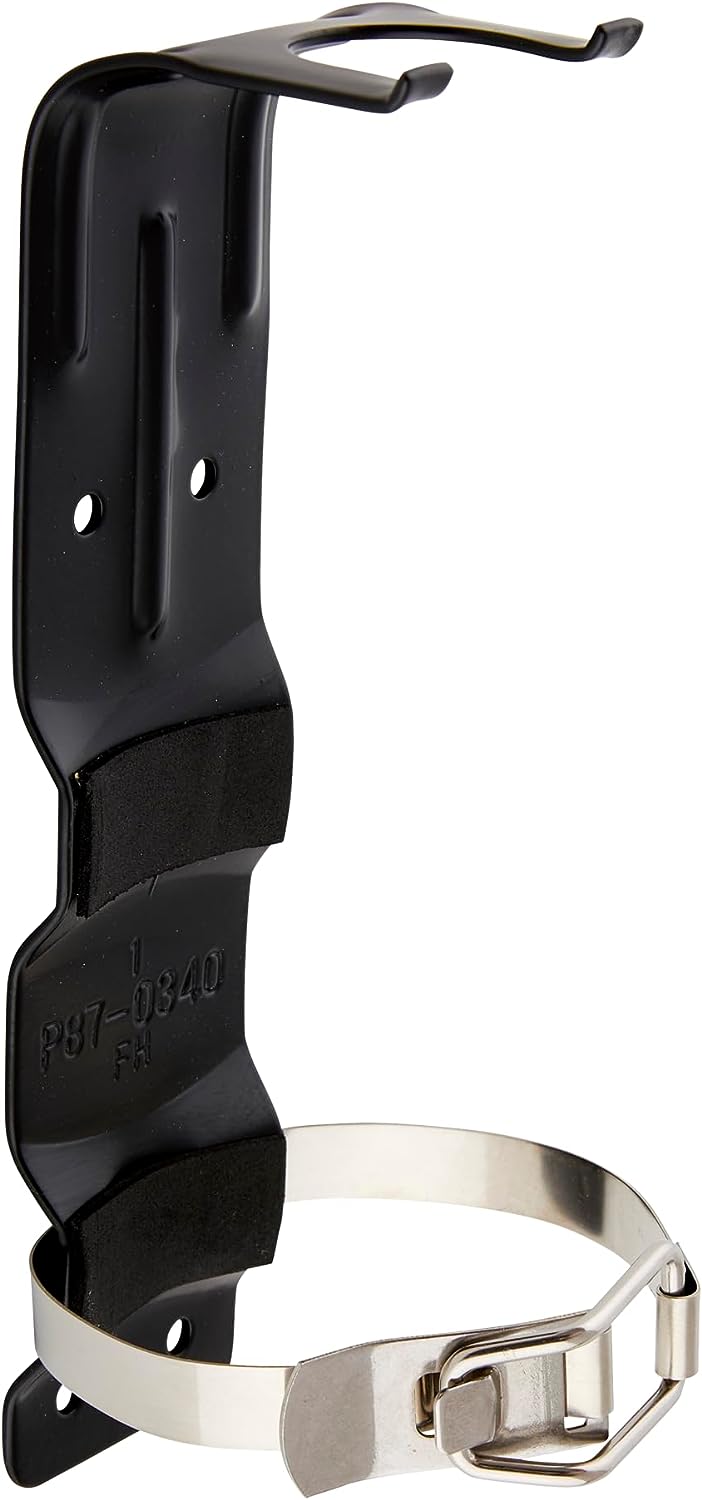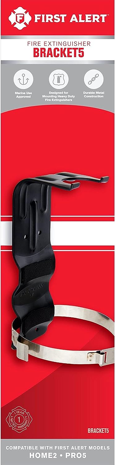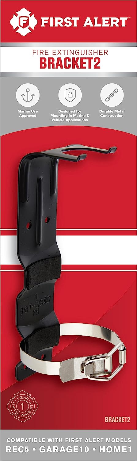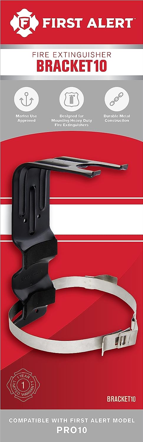 This First Alert BRACKET2 heavy duty fire extinguisher mounting bracket is designed for use ONLY with First Alert Models FE10GR (AUTOMAR10 & GARAGE10) and FE1A10GR (HOME1, DHOME1, & MARINE1). This bracket is UL listed and has a durable metal construction with corrosion resistant coated finish and stainless steel straps.