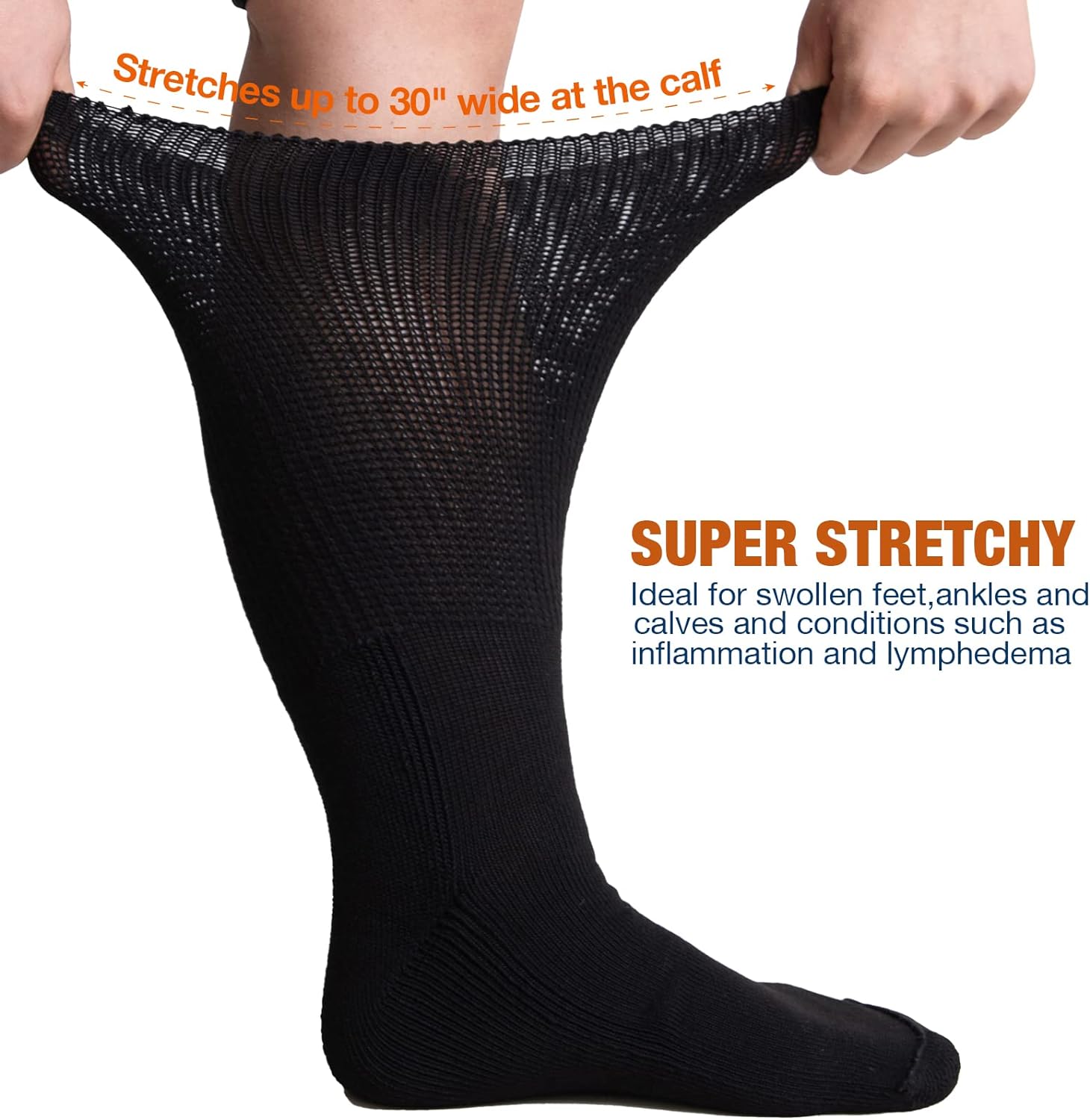 • Super Wide Socks for Swollen Feet -Super Wide Socks are different from other wide diabetic socks in market. The top of socks can stretches up to 30" wide and the socks with thicker footbed design, you will not feel cold on sole.Our socks have an anti-Slip down design at the top,preventing socks slip down around your ankles effectively after wearing it for a while.Cast socks can help you reduce the pain from ankles, swollen feet ,or calves resulting from lymphedema and similar condition.