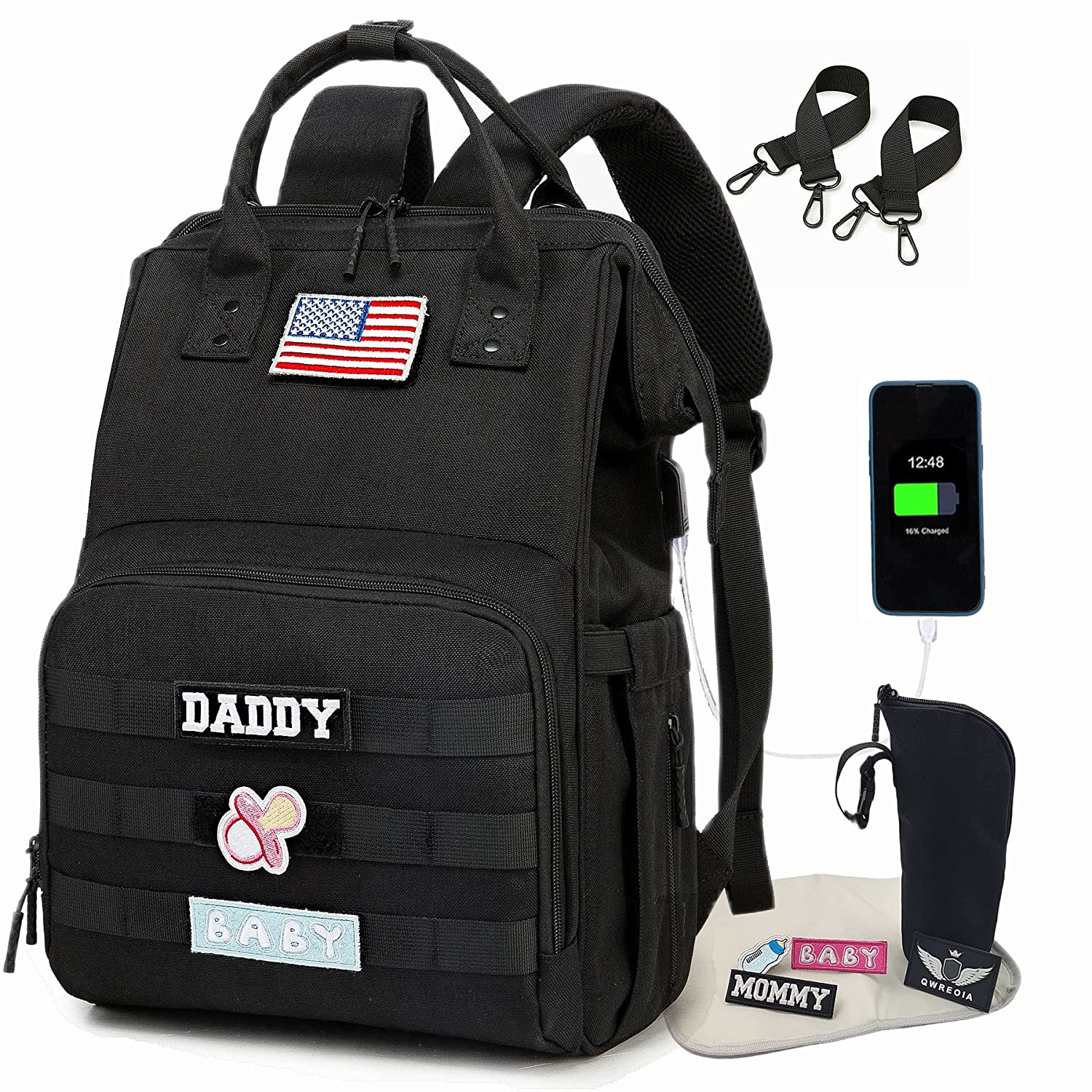 QWREOIA Diaper Bag Backpack with USB Charging Port Stroller Straps and Insulated Pocket,army military Travel Nappy Backpack for Dad/Mom (Black)