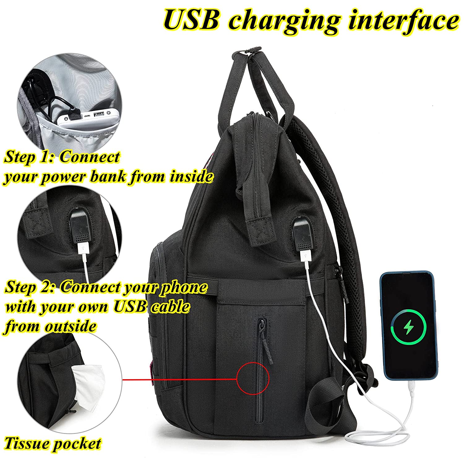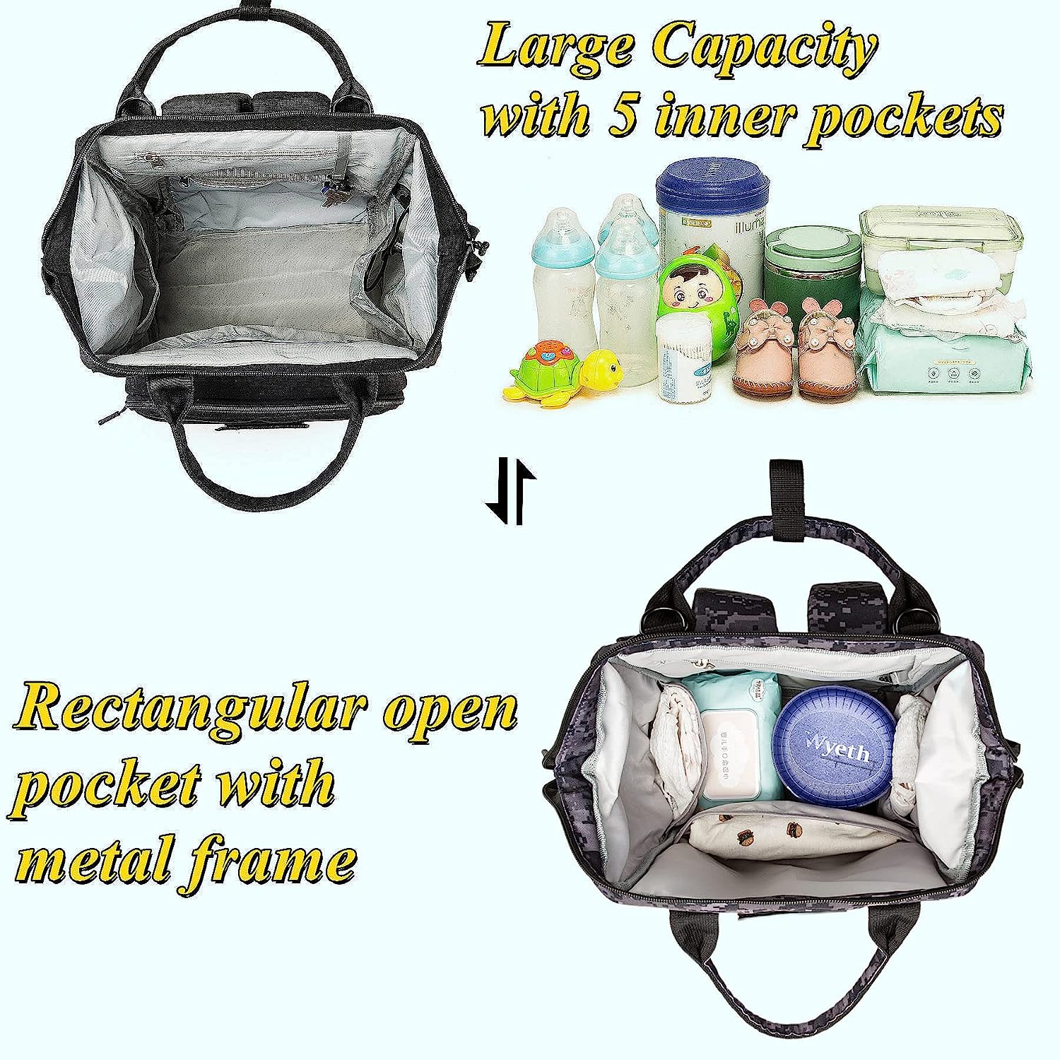 • ⭐Stylish&Convenient:Neutral Design Diaper Bag in Fashion Black Colour.Hands-free by the Stroller Straps, One-Hand Controlling via the Easy-taking Zipper and the Outside Pockets without Opening the Big Zipper. It has both shoulder strap and hand-held strap, so you can use it as backpack or tote bags according to your needs.