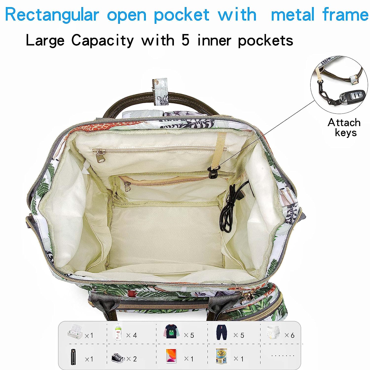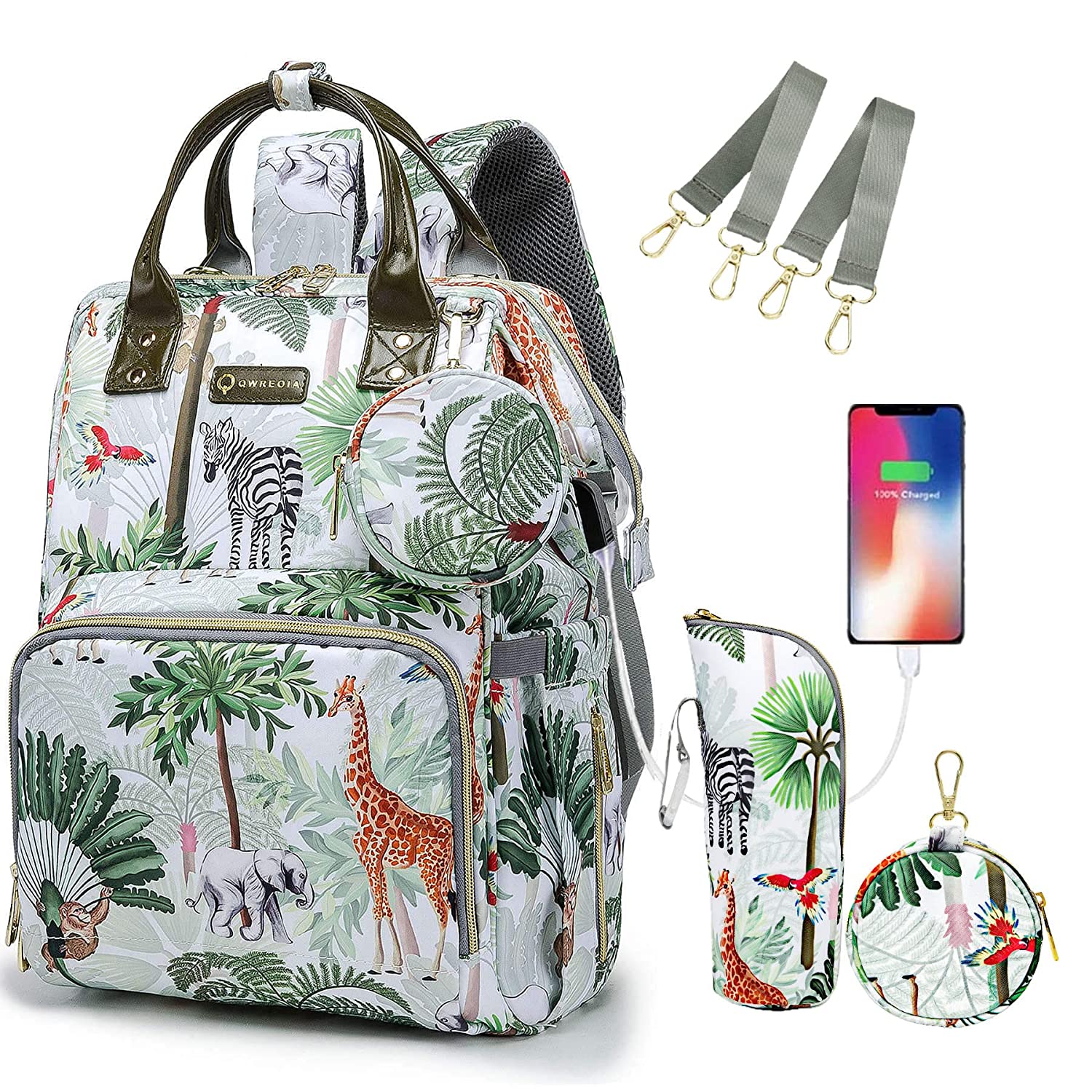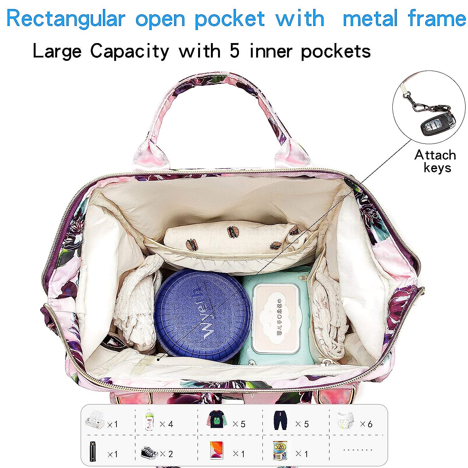 • ⭐5-Pieces Set:1 Backpack Diaper Bag(Size:10.6l*6.5w*16.5h inches) with Key Holder,1 Extra Insulated Pocket(Size:3.15dia*10.2h inches),1 Water Resistant Changing Pad(Size:18.5l*12.6w inches), 2 Stroller Straps