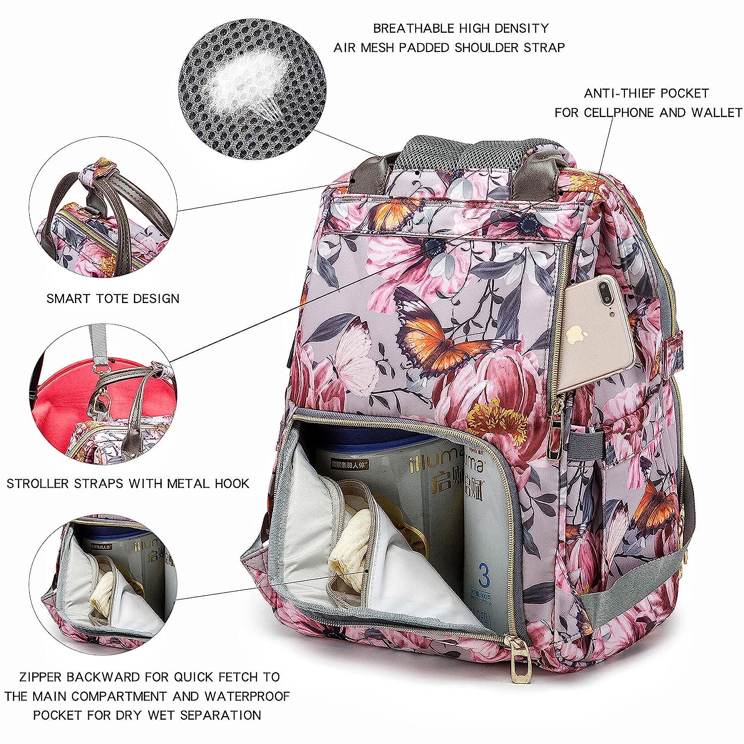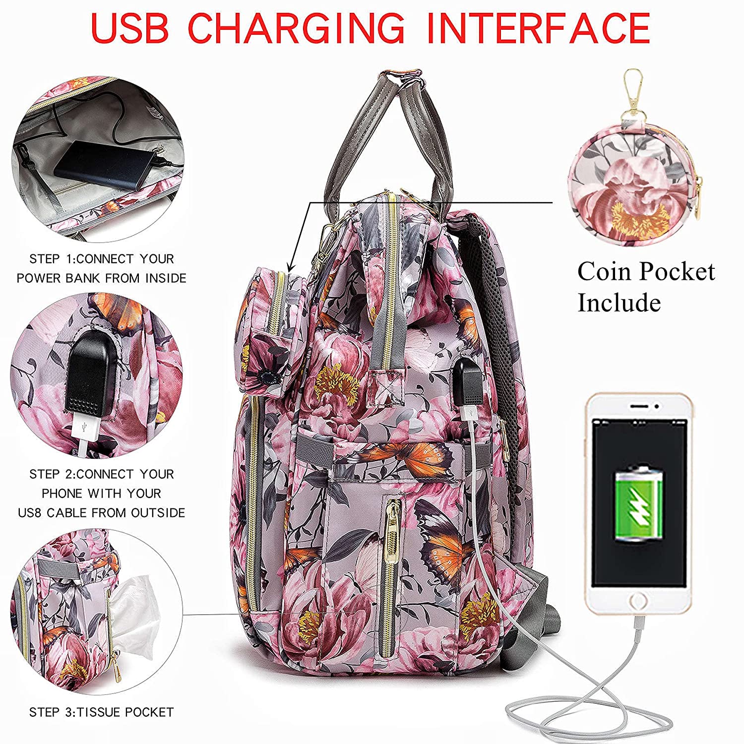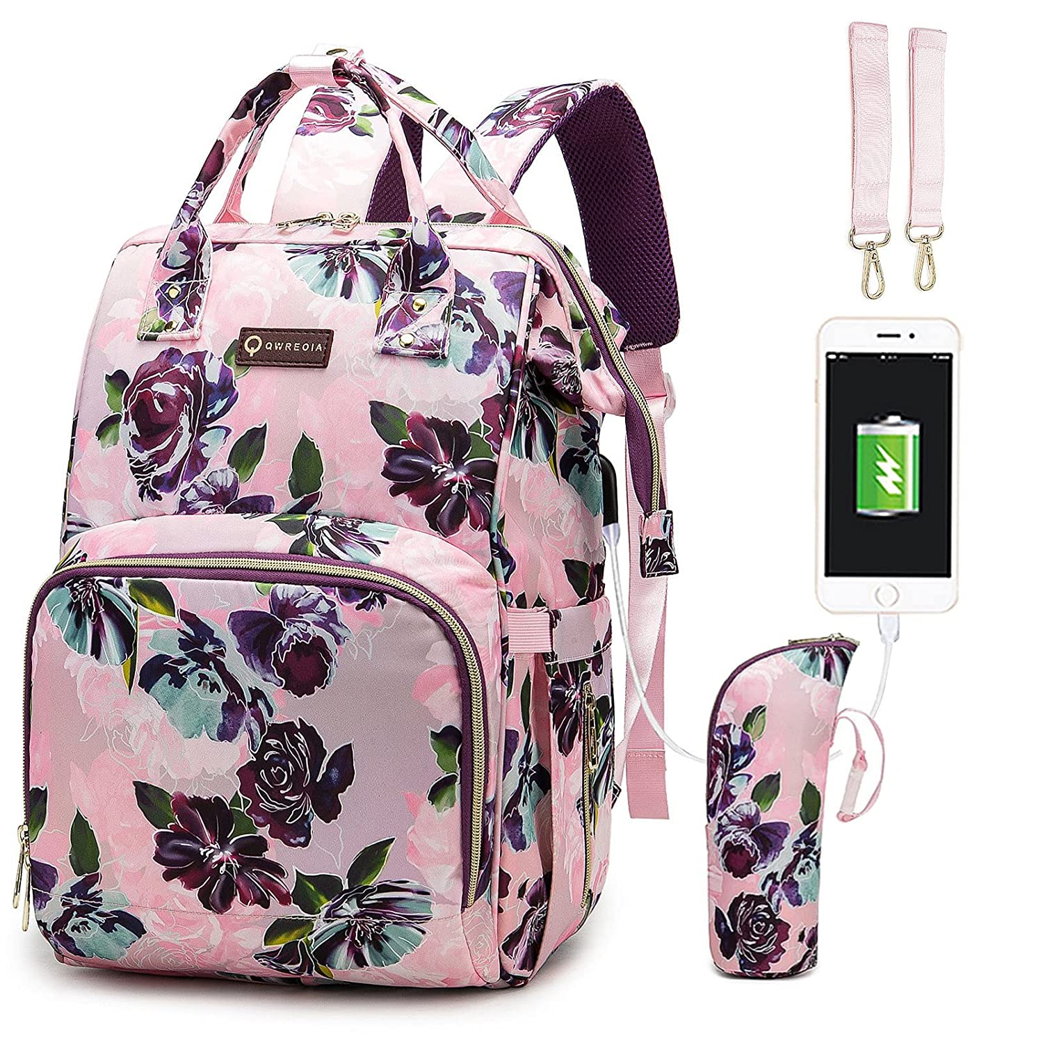 QWREOIA Floral Diaper Bag Backpack with USB Charging Port Stroller Straps and Insulated Pocket,Travel Nappy BackpackFor Women/Mum (Flower Pattern)