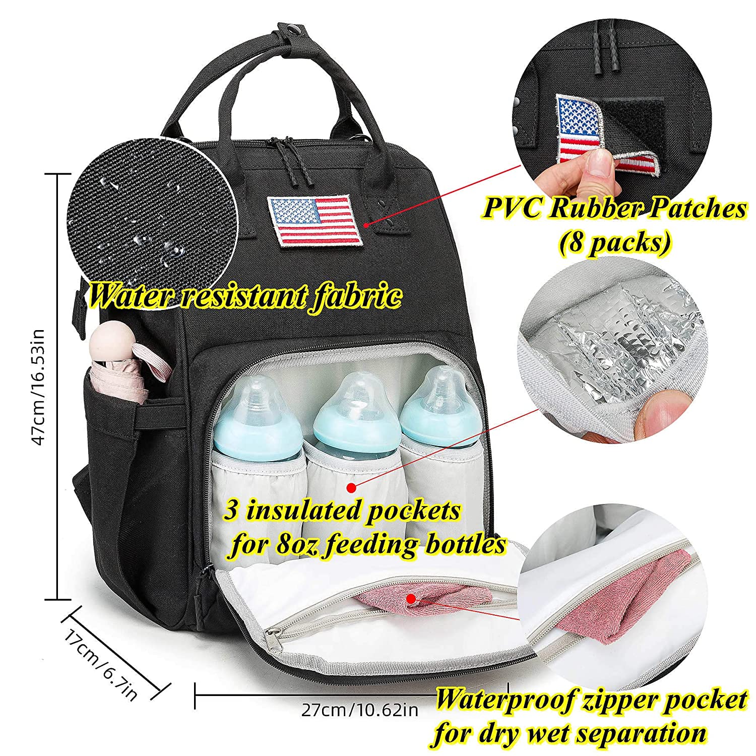 • ?5-Pieces Set:1 Backpack Diaper Bag(Size:10.6l*6.7w*16.5h inches) with Key Holder,1 Extra Insulated Pocket(Size:3.15dia*10.2h inches),1 Water Resistant Changing Pad(Size:18.5l*12.6w inches), 2 Stroller Straps An amazing compact diaper backpack that combines style, versatility and convenience that can be carried by moms and dads alike. This elegant nappy bag is suitable for outdoor, shopping mall, family travel, business office, etc.