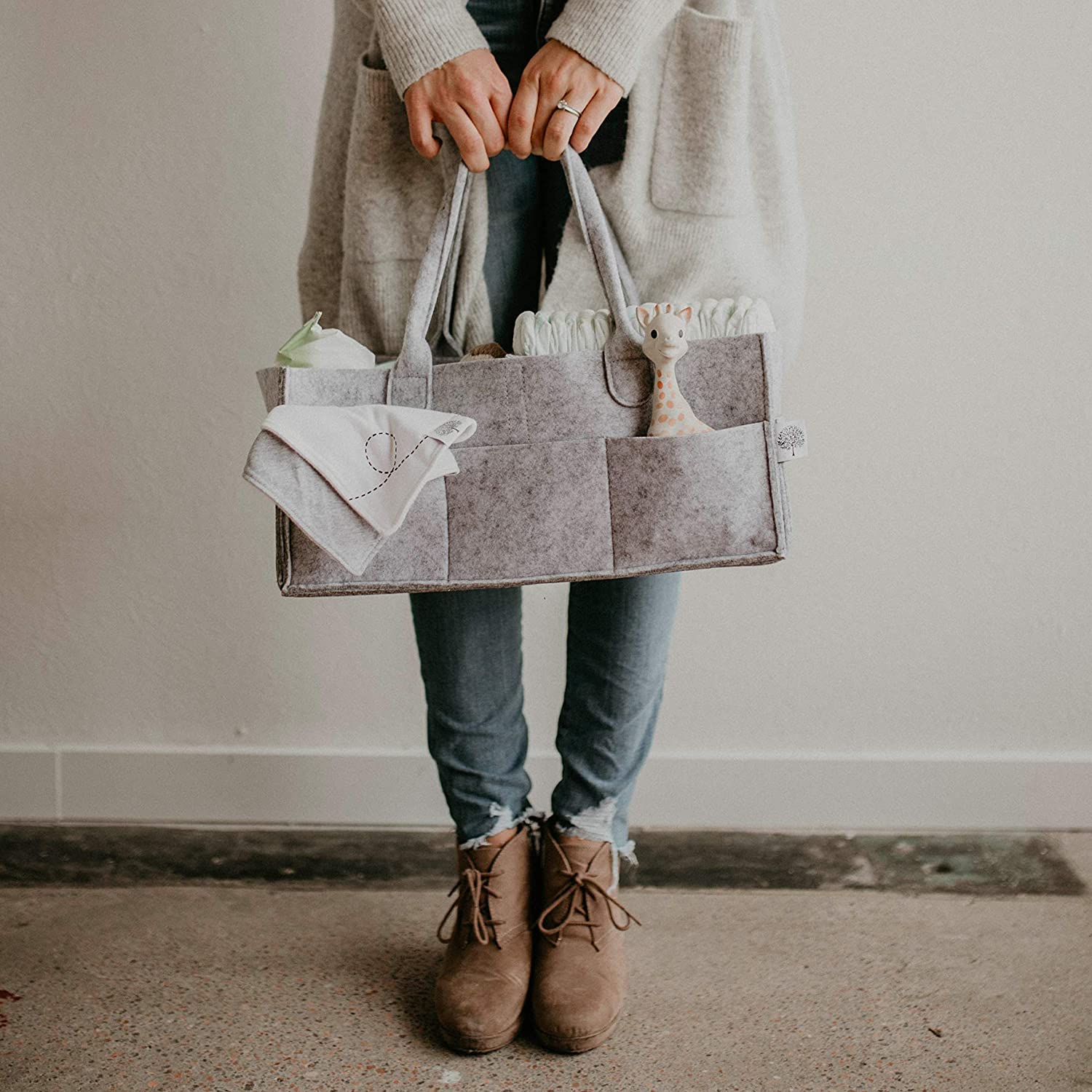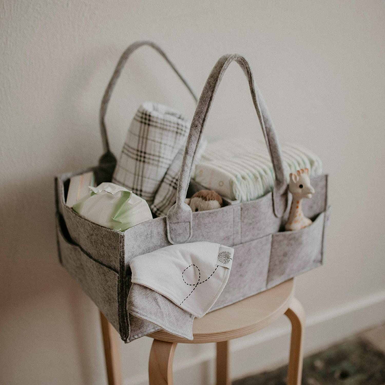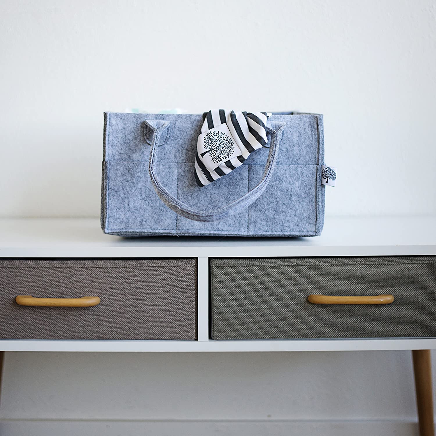 • DESIGNED TO COMPLIMENT YOUR NURSERY DECOR - Our diaper caddy basket is designed with neutral grey colors to look good in any room. It looks good on your changing table, on top of a dresser or next to the diaper pail and is an essential item for your diaper changing station. Easily move the tote around using the long handle.