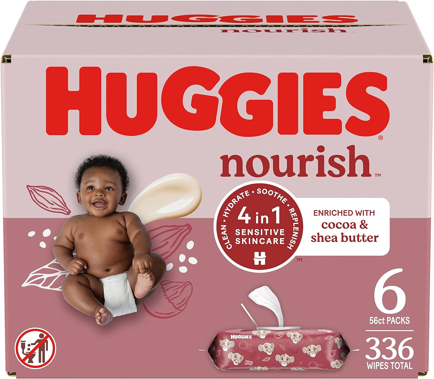 Clean, hydrate, soothe and replenish your baby's delicate skin with the 4 in 1 Sensitive Skincare of Huggies Nourish Baby Wipes. Each baby wipe is lightly scented and enriched with cocoa and shea butter for a luxurious experience. Offering you plant-based ingredients* for over 20 years, these diaper wipes are hypoallergenic, dermatologist-tested and pH-balanced to help maintain healthy skin. They are also alcohol free, paraben free and do not contain phenoxyethanol or MIT. Plus, with a push-button feature and EZ Pull 1-Handed Dispensing, it’s easy to grab wipes when your hands are full. Featuring Disney's The Lion King designs that are as cute as your baby, Huggies Nourish disposable wipes are perfect to pair with your Huggies diaper! Join Huggies Rewards+ powered by Fetch to get rewarded. Earn points on Huggies diapers and wipes, in addition to thousands of other products to redeem for hundreds of gift cards. Download the Fetch Rewards app to get started today! (*70%+ by weight)