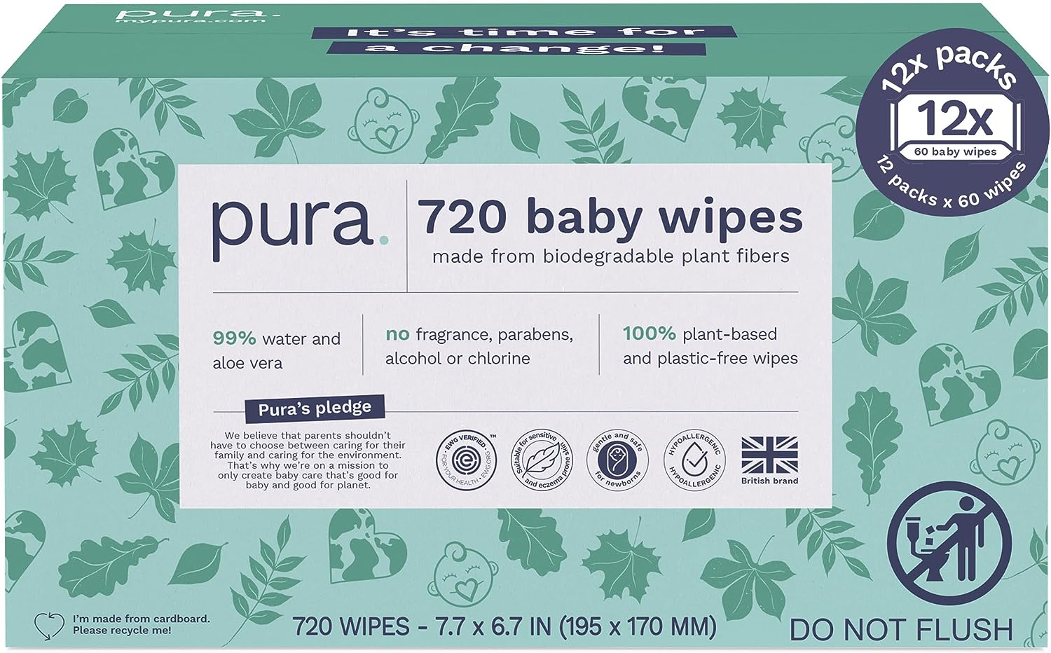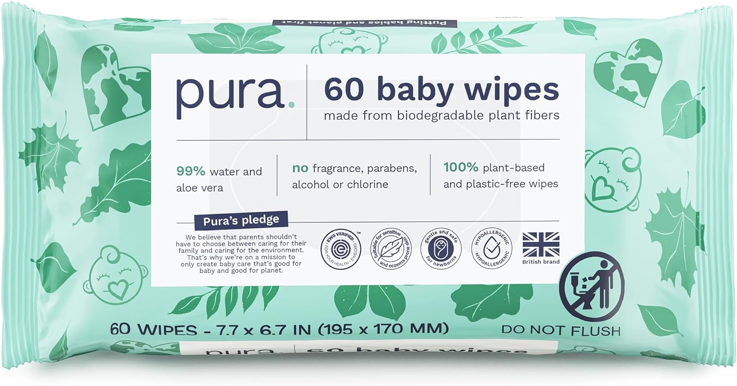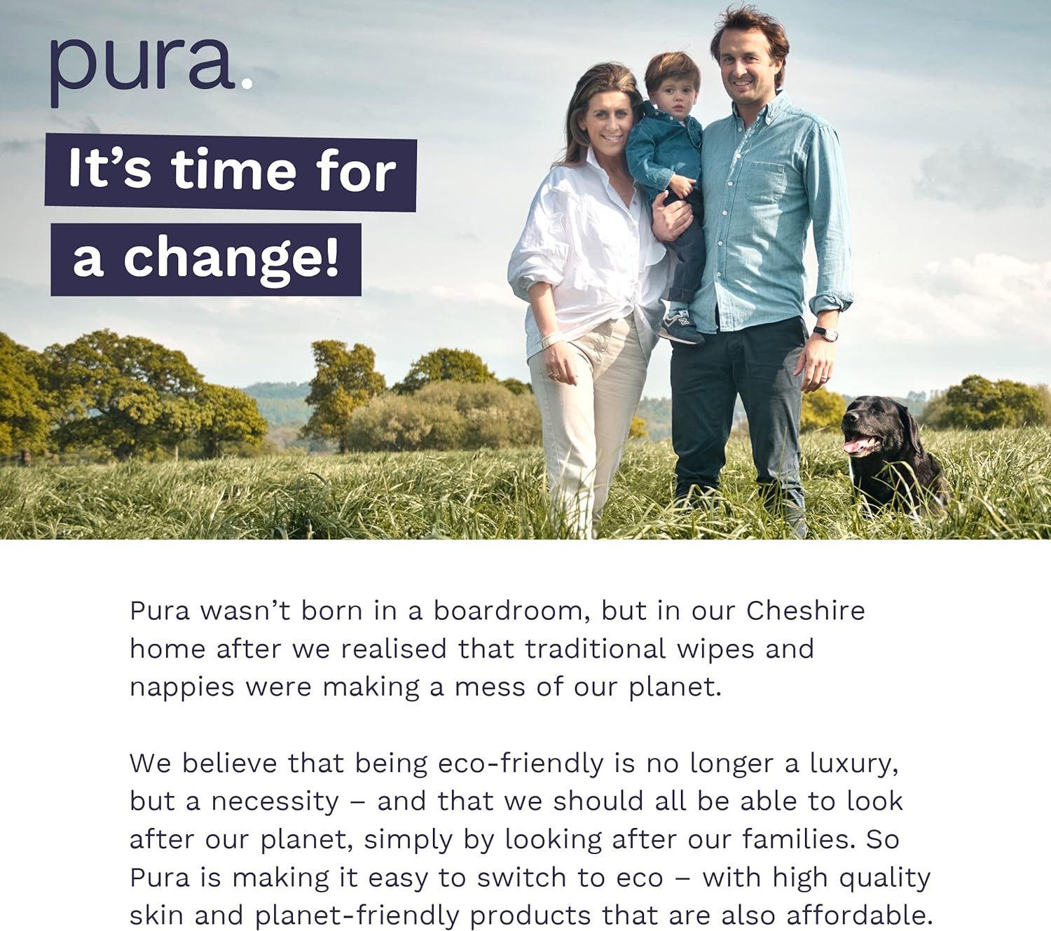 Pura has created a wipe that can safely clean up big messes without making one for the planet. Soft and strong, our 100% plastic-free wipes contain 99% water and aloe vera and are made from certified sustainably sourced biodegradable plant-fibers. Fragrance-free, EWG Verified and Allergy UK certified, they’re kind to babies and their world. Meet the Pura family Pura didn’t start in a boardroom. It was born in the British home of Guy and Abi Fennell. Created by parents, for parents, Pura was founded to make clean, safe and planet-friendly products affordable for all. Pura is a Carbon Neutral business and a certified B-Corp.