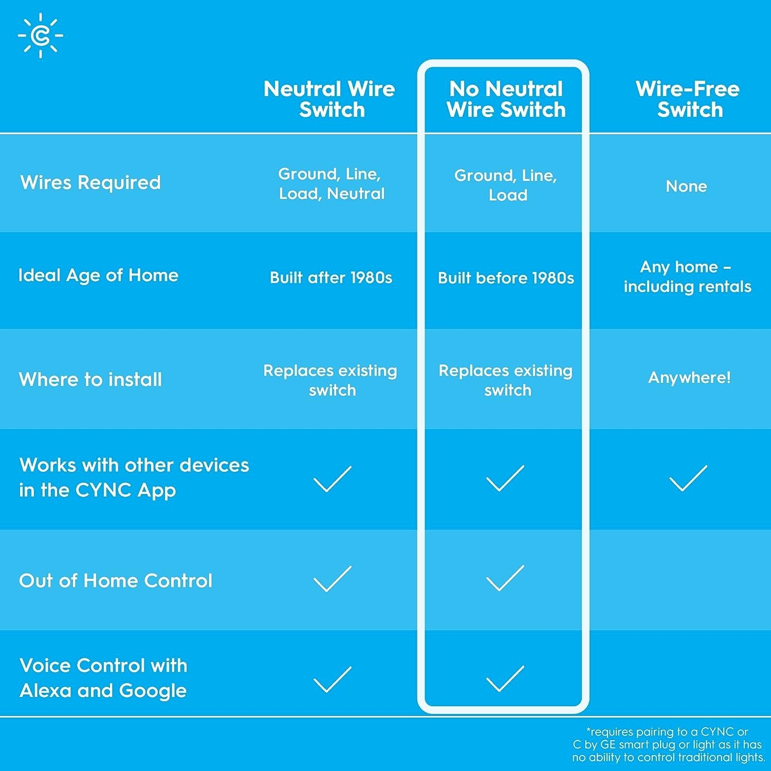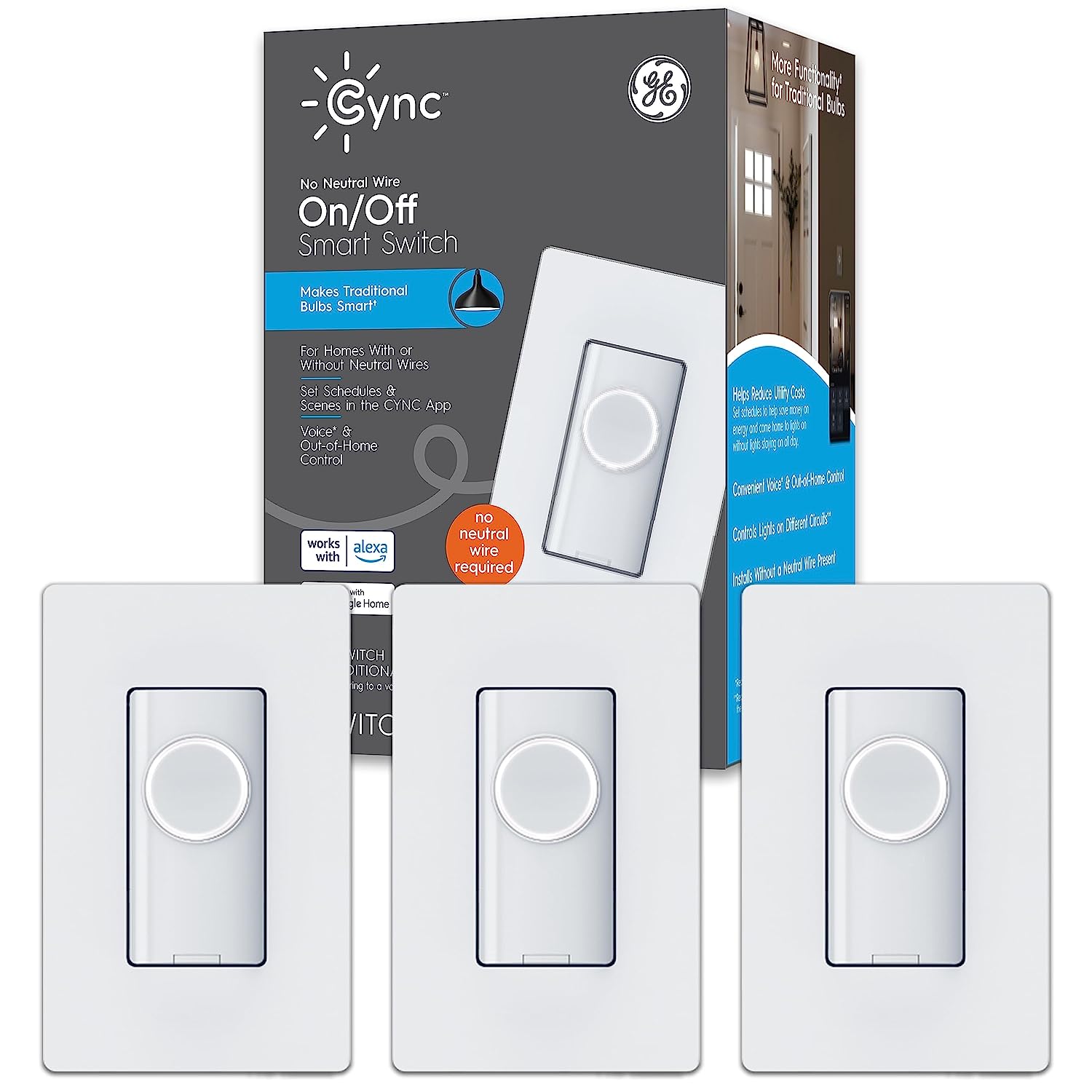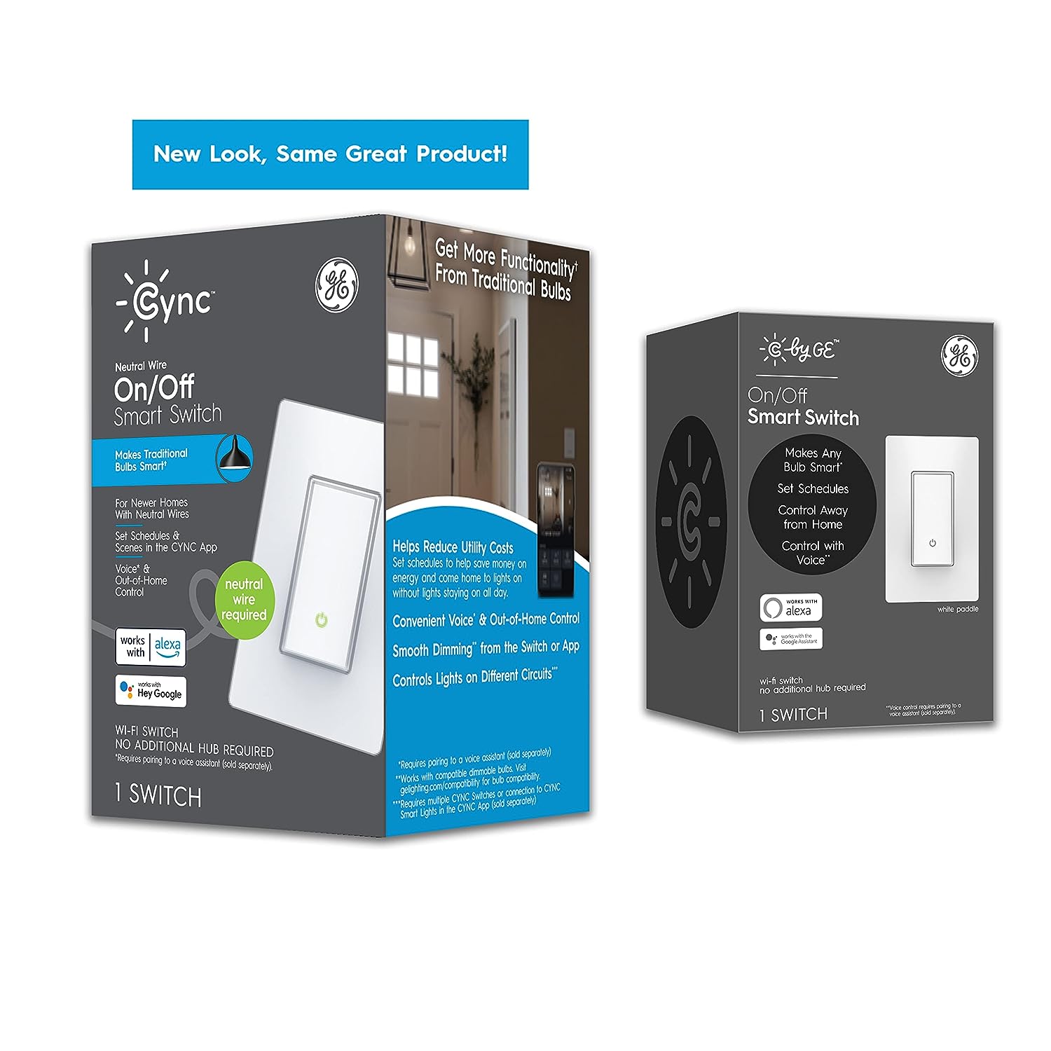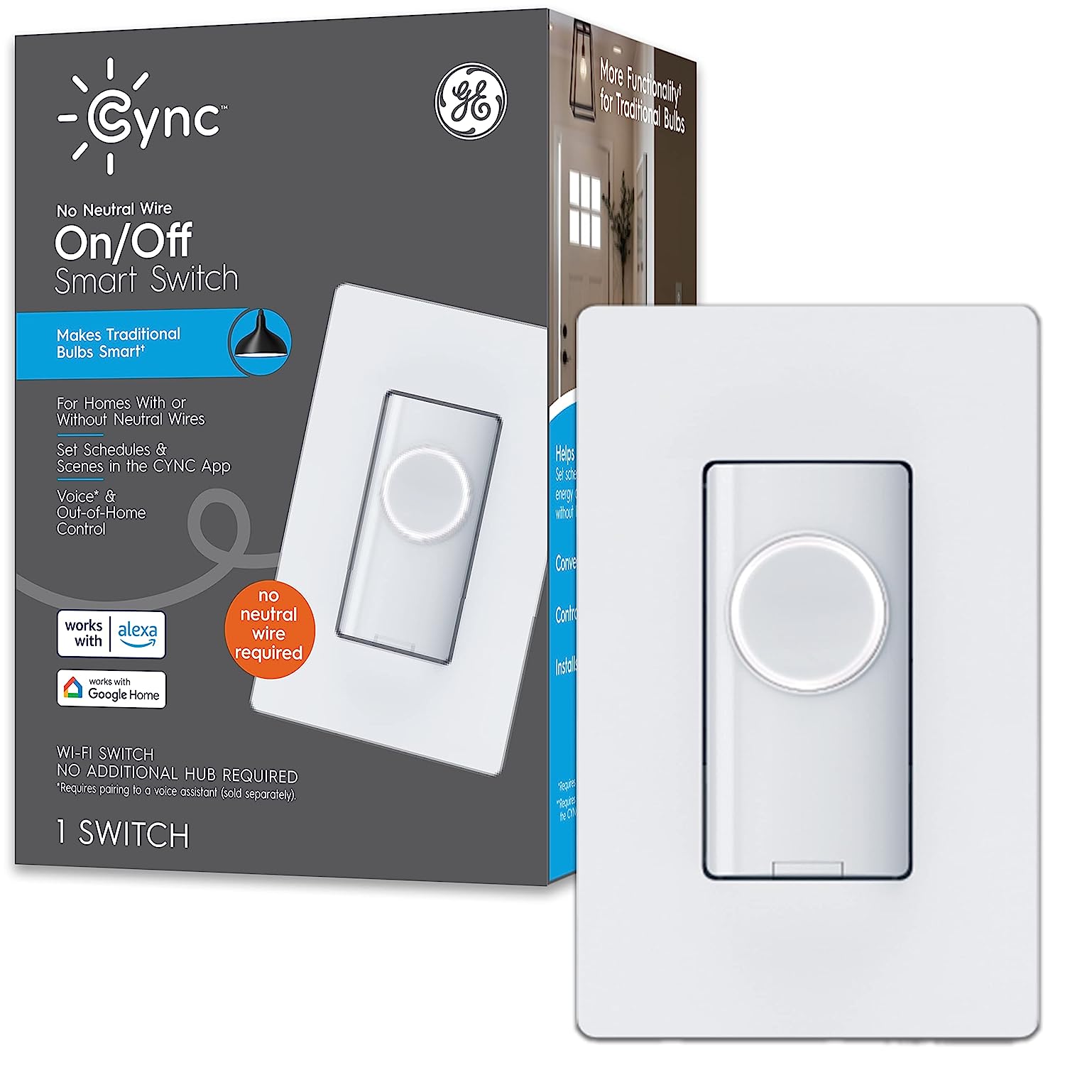The Cync On/Off Smart Switch adds smart bulb functionality to traditional bulbs and keeps smart bulbs smart. The smart Wi-Fi switch adds out-of-home control, scheduling and scene setting to traditional bulbs. When Cync or C by GE smart bulbs are installed, the smart switch allows app or voice control even when power is turned off at the switch. Pair the Smart Switch with Cync or C by GE Smart Bulbs in other fixtures like table lamps and control your all your lights in the room from one wall switch. C by GE On/Off Smart Switch wirelessly connects with other Cync and C by GE Smart Switches so you can control the same light fixture from multiple switches – connecting the switches wirelessly still applies, even if the switches are on different circuits. Simple DIY set up. The Smart Switch connects directly with Google Home and Amazon Alexa devices without a hub required. Works with most common residential wiring-no neutral wire required.