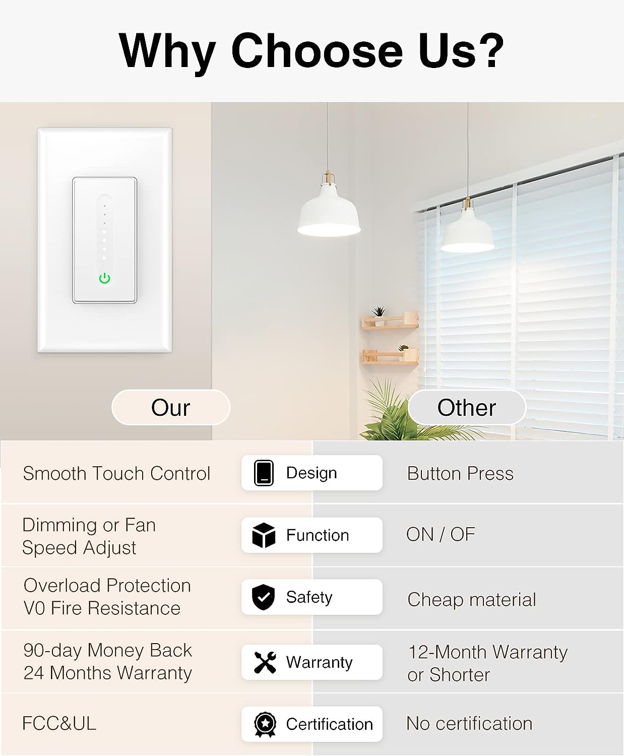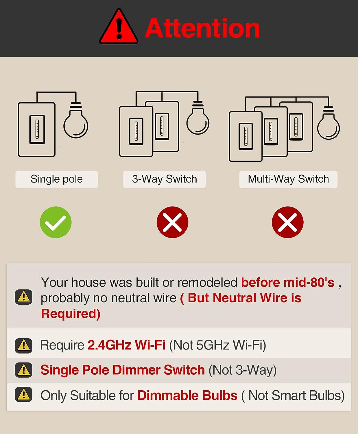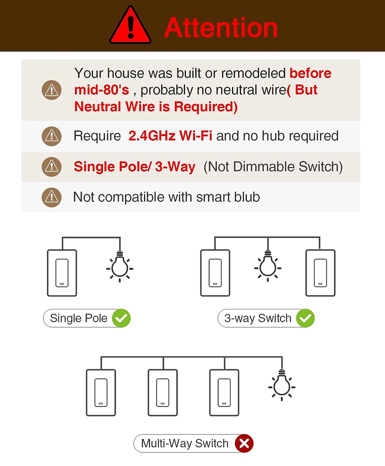 • Note-UL Certified;Neutral Wire is needed; Step-by-step instructions will guide you through the wiring process.Standard size fits any standard multi-gang wall plate.single-pole use only (NOT 3-way);"2.4G” WiFi only for the first time installation (NOT 5G)