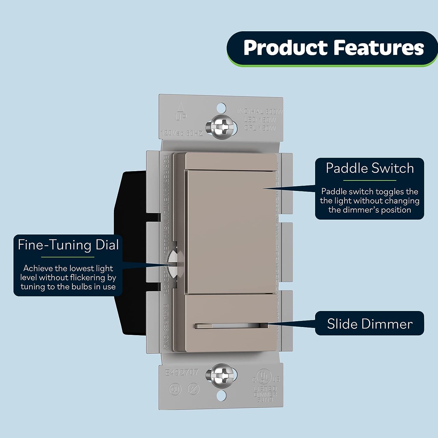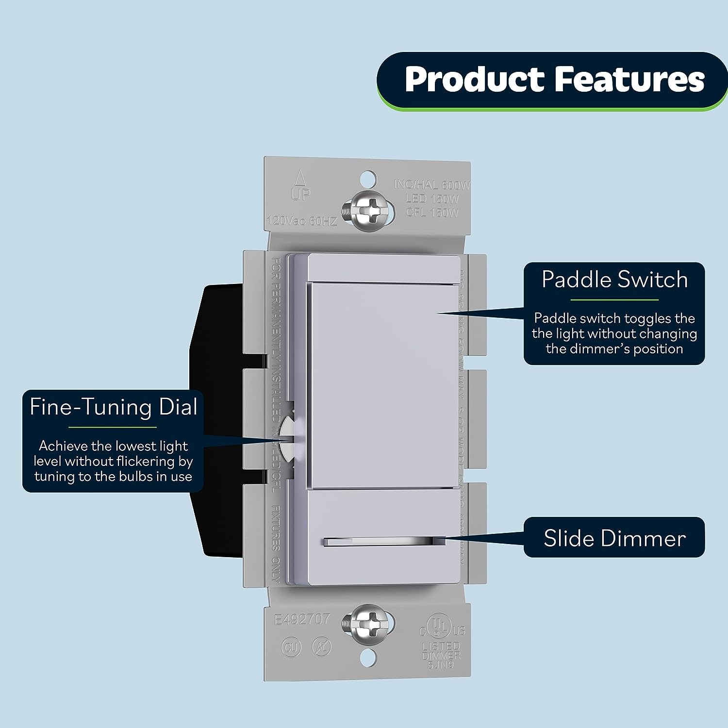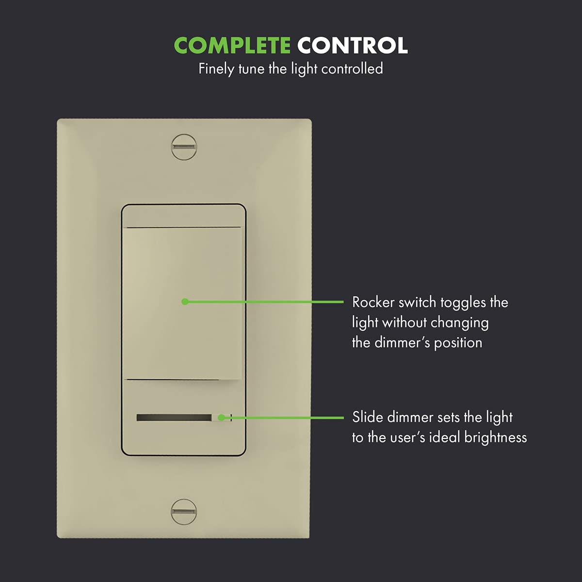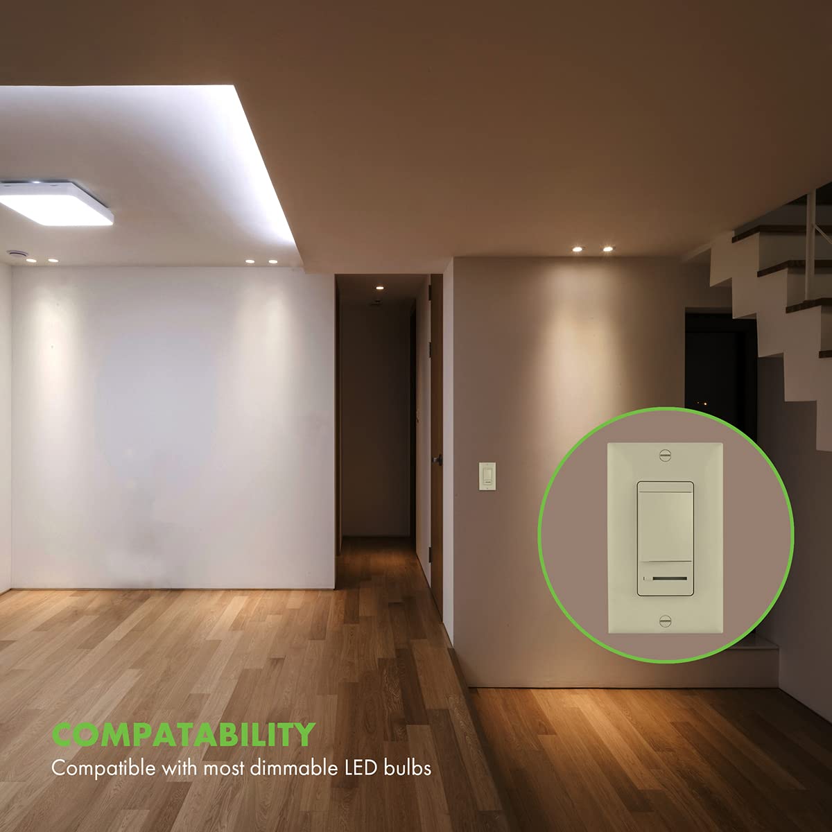 • White color; dual load; 200W LED/CFL; 300W incandescent/halogen; compatible with dimmable light bulbs only; single pole only; #14-#12 AWG (copper only); neutral wire not required; 1-year warranty; UL listed