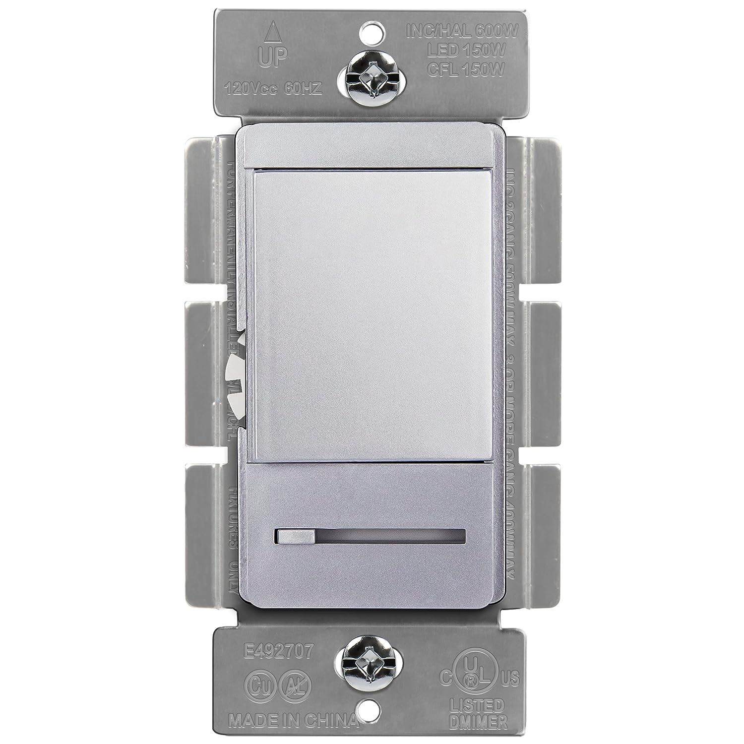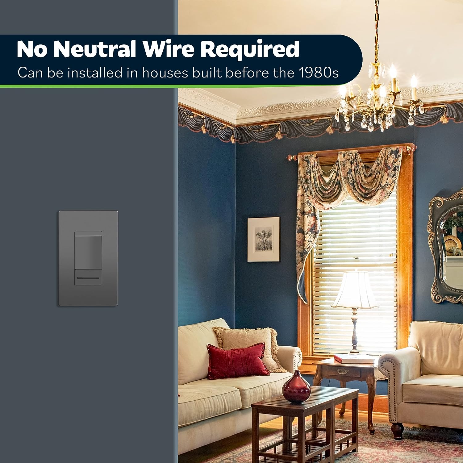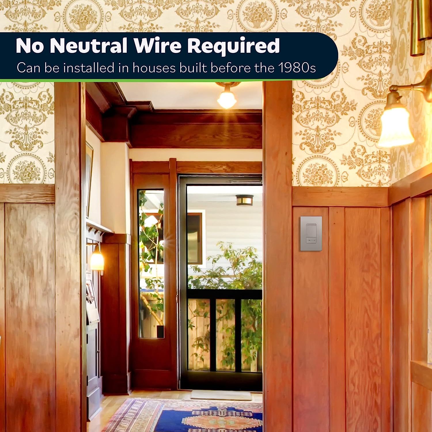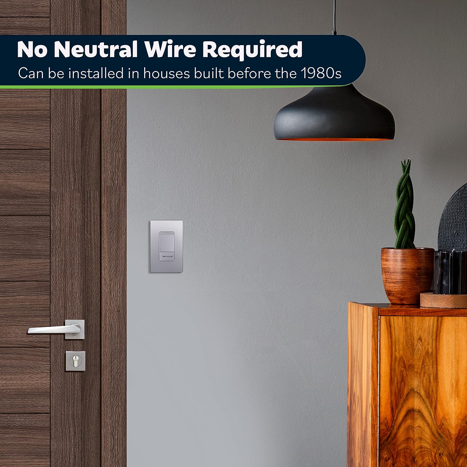 • White color; dual load; 200W LED/CFL; 300W incandescent/halogen; compatible with dimmable light bulbs only; single pole only; #14-#12 AWG (copper only); neutral wire not required; 1-year warranty; UL listed