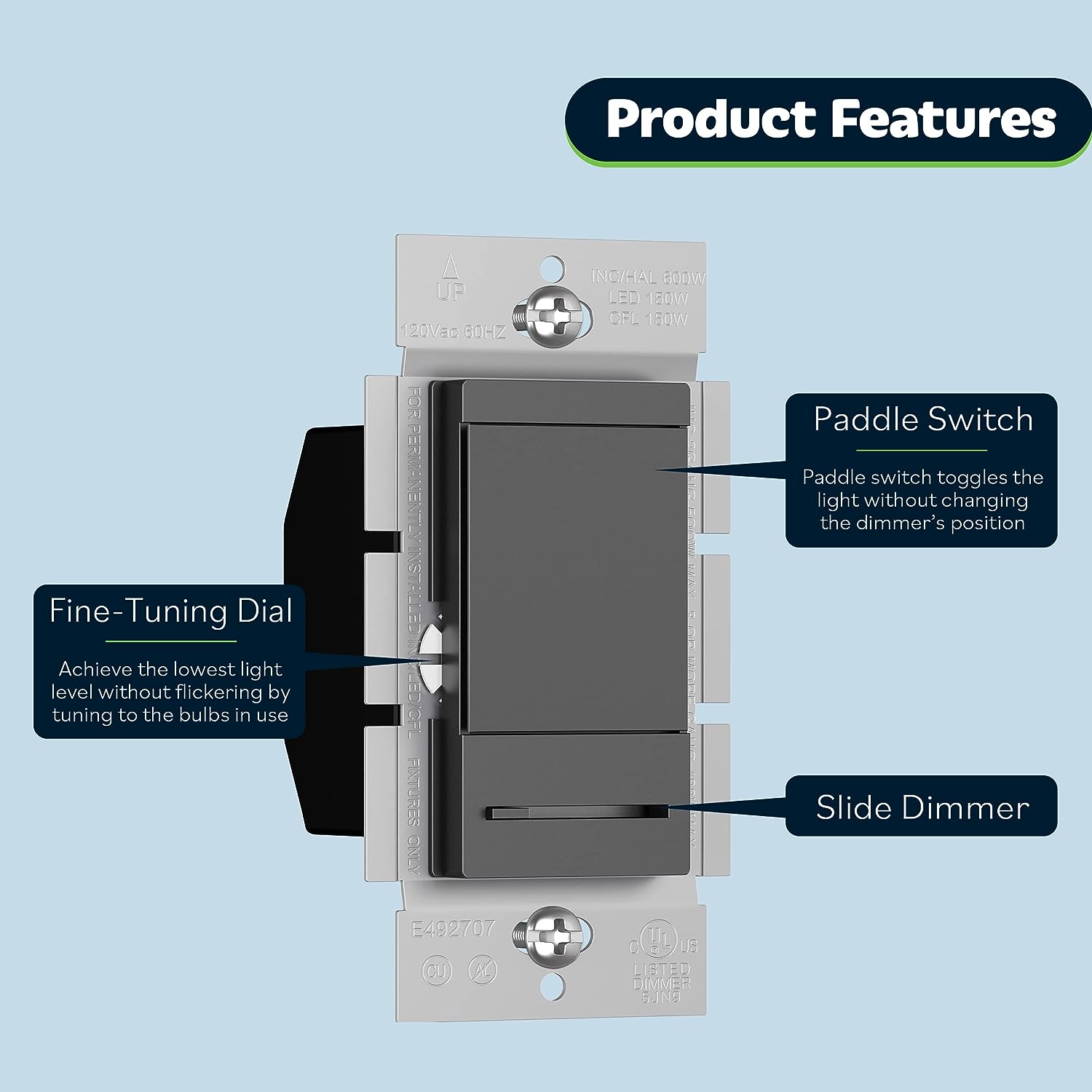 • Features two easy-to-use sliders for full-range dimming of two separate loads; to turn the lights OFF, move the slider all the way down until it clicks