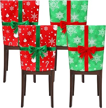 4 Pack Christmas Chair Covers Chair Back Covers for Dining Chairs Removable Washable Stretch Christmas Chair Covers with Bowknot for Christmas Home, Kitchen, Dining Room Chair Decoration