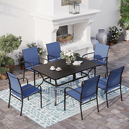 7 Piece Outdoor Dining Chairs Blue, Steel Dining Table with 1.57" Umbrella Hole, Patio Dining Set for Outdoor Kitchen Lawn Garden, with 6 Pieces Chairs.