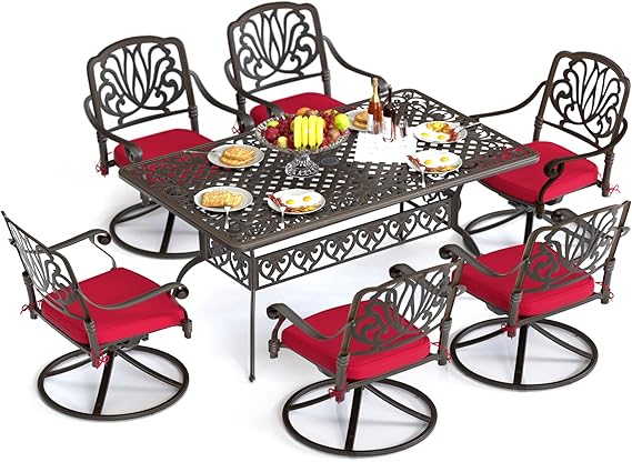 7 Pieces Outdoor Dining Set, Cast Aluminum Retro Patio Dining Set Includes 59" Rectangular Dining Table with Umbrella Hole and 6 Swivel Chairs with Red Cushions for Garden Yard
