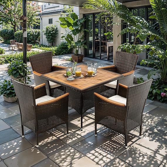 RoyalCraft 5 Piece Patio Wicker Dining Sets for 4, Water-Resistant Rattan Outdoor Dining Table and 4 Chairs with Wood Table Top, Conversation Set for Deck, Garden, Backyard, Removable Cushions, Teak