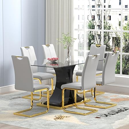 63" Rectangle Modern Glass Dining Room Table Sets for 6, Glass Dining Table with 6 PU Leather C-Shape Chairs with Handle, 1 Black and Gold Base Glass Table and 6 Golden Leg Light Gray Chairs