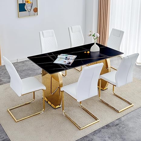 63_‹�Luxury Dining Table Set for 6, Faux Marble Dining Table Set for 6, Modern Dining Table Set, Black Patterned Tabletop with PU Leather Dining Chairs for Dining Room, Kitchen, Hotel (ChairC -White)