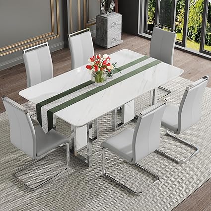 67'' Modern Dining Table Set for 6, White Kitchen Table Set, Luxury Dining Table Set with 1.8-inch Thick Faux Marble Table Topâ__6 Pu Leather Upholstered Chairs Ideal for Dining kicken Room