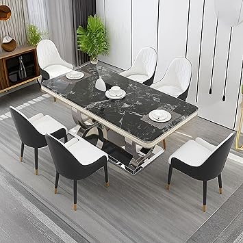 7 Piece Marble Dining Table Set, 79" Modern Kitchen Table with Double-Circle Shaped Stainless Steel Base, Luxury Black Dining Set with 6 Black-White Dining Chairs for Home, Kitchen