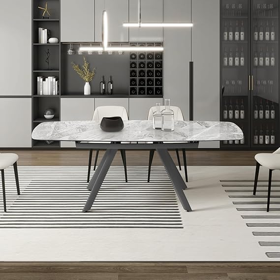 Extendable Dining Table for 6-8 Seat, 55.1'' to 82.7'' Sintered Stone Oval Kitchen Table, Modern Dining Room Table with Rounded Corner for Kitchens, Dining Room, Office Areas(Gray Glossy Tabletop)