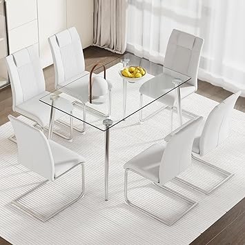 Glass Dining Table Set for 6, Modern Kitchen Dining Table with PU Leather Dining Chairs Set of 6, 7 Piece Dining Table Set for Dining, Living Room, Office, Home (White, 1 Table + 6 Chairs)