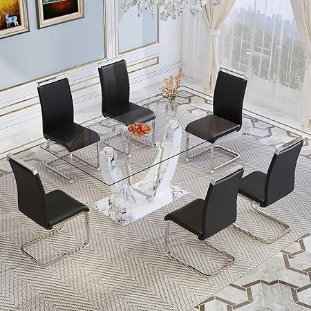 JUFU 71" Glass Dining Table Set for 6, White Marble Texture Dining Room Table Set with MDF Base, 0.39" Thick Tempered Glass Top Kicken Room Table Set Ideal for Kicken Dining Room