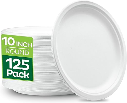 100% Compostable 10 Inch Heavy-Duty [125-Pack] Eco-Friendly Disposable White Bagasse Plate, Made of Natural Sugarcane Fibers - 10" Biodegradable Paper Plates by Stack Man