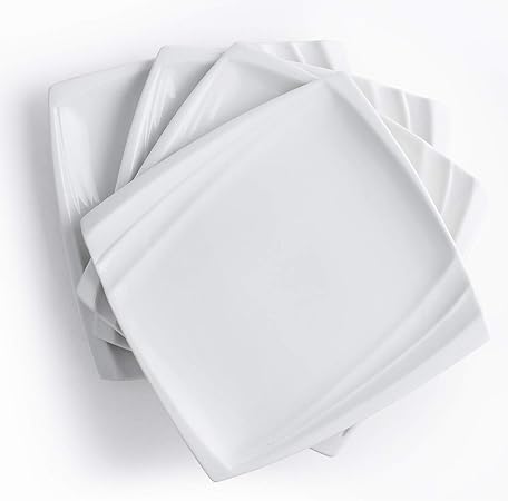 10 Inch Square Dinner Plates White Set of 4 Modern Lunch Serving Plates (Wave Design)