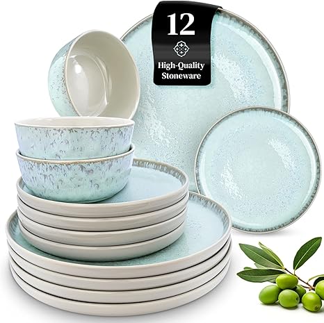 12 Piece Dinnerware Sets for 4 - Modern Style Stoneware Dinnerware Set - Scratch Resistant, Dishwasher, Microwave Safe Plates and Bowls Sets Ceramic, Bowl and Plate Set - Beige and Light Blue_†_