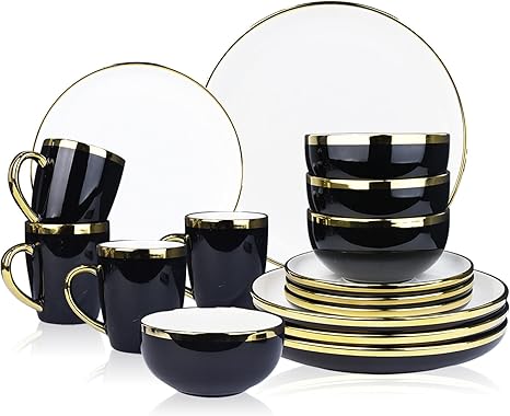 16-Piece Plates and Bowls Sets, Ceramic Dinnerware Sets for 4, Stoneware Dishes Set with Gold Trim, Round, Black