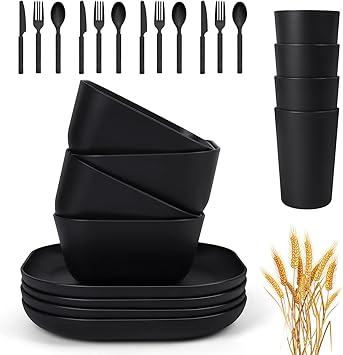 24 Piece Wheat Straw Square Dinnerware Sets for 4, Unbreakable Dinner Plates and Bowls Sets for Camping Party Grill (Black)