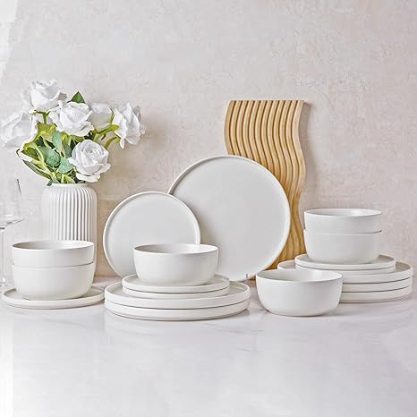 AmorArc Stoneware Dinnerware Sets of 6, Reactive Ceramic Plates and Bowls Set, Highly Chip and Crack Resistant | Dishwasher & Microwave Safe | Round Dishes Set Service for 6 (18pc)-Matte White