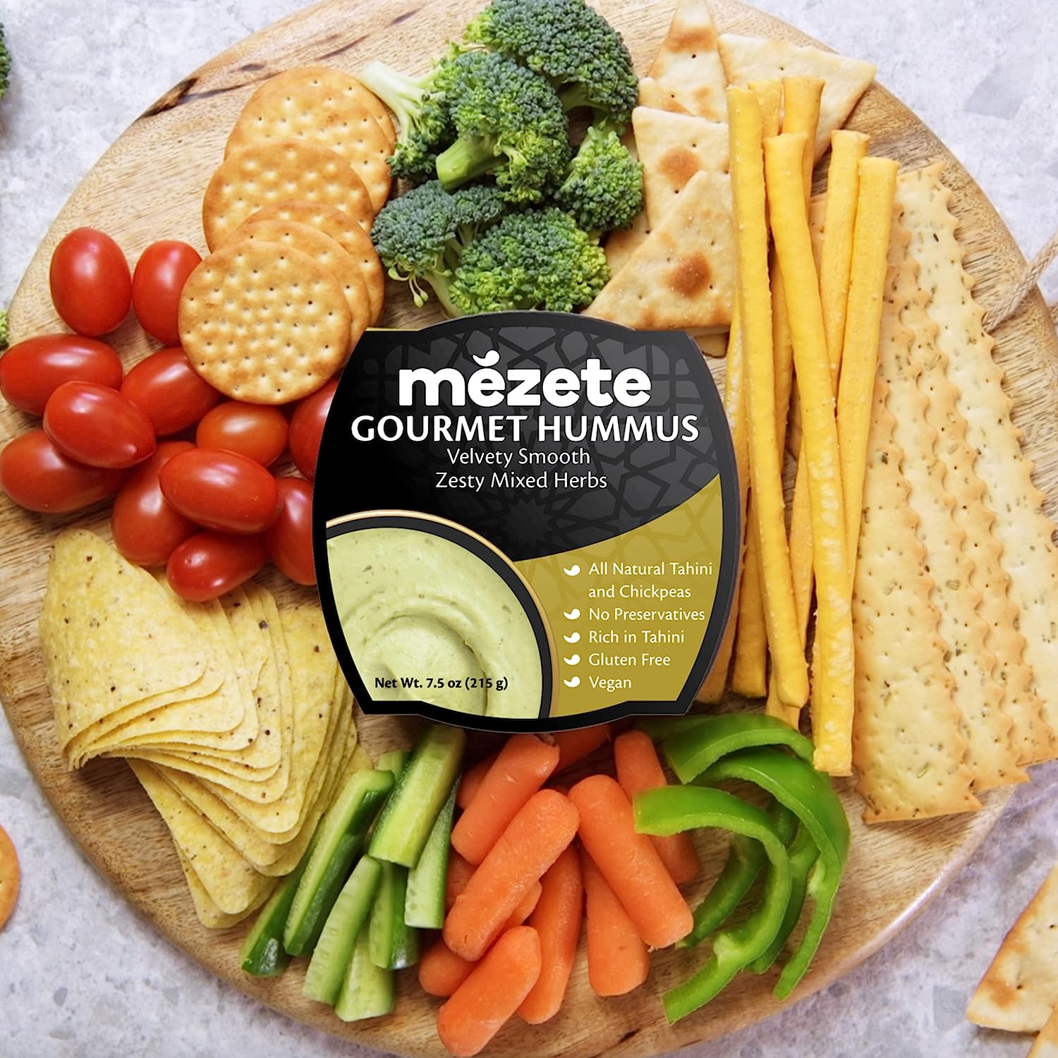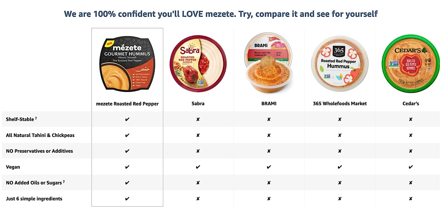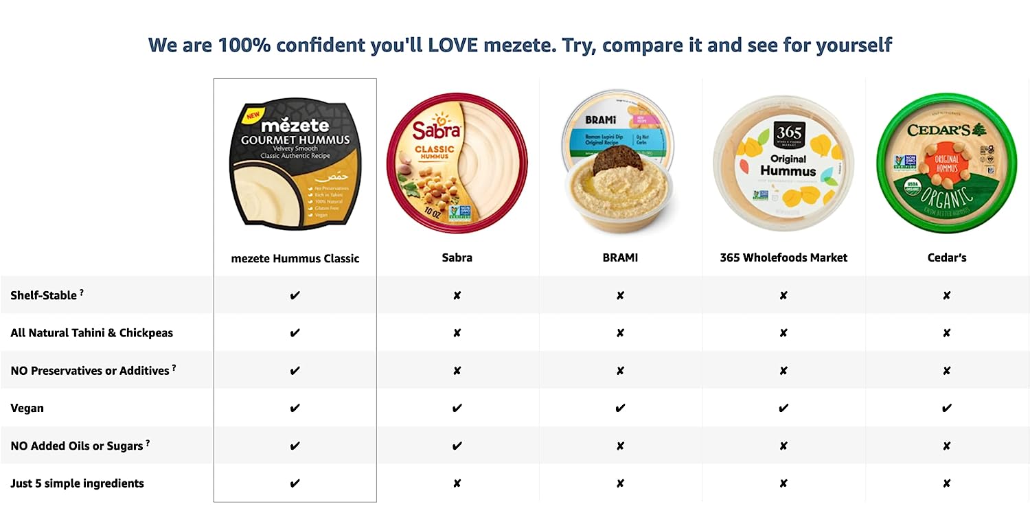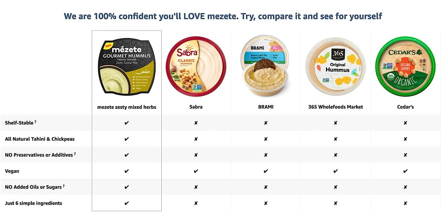 Mezete Classic Hummus, 100% All Natural Dips and Spreads, On the Go Tahini Rich Vegan Dip with No Preservatives, Gluten-Free, Shelf-Stable, and No Refrigeration Required, 7.5 Ounce