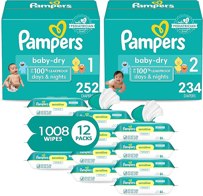 Pampers Baby Dry Disposable Baby Diapers Starter Kit (2 Month Supply), Sizes 1 (252 Count) & 2 (234 Count), with Sensitive Water Based Baby Wipes 12X Multi Pack Pop-Top and Refill (1008 Count)