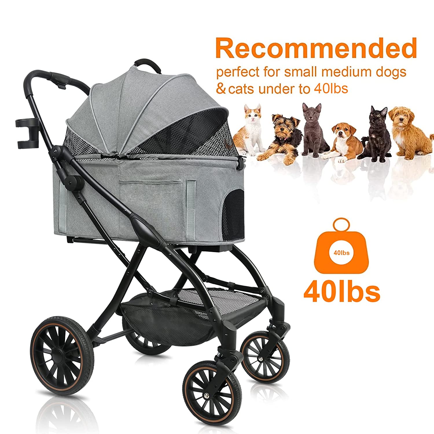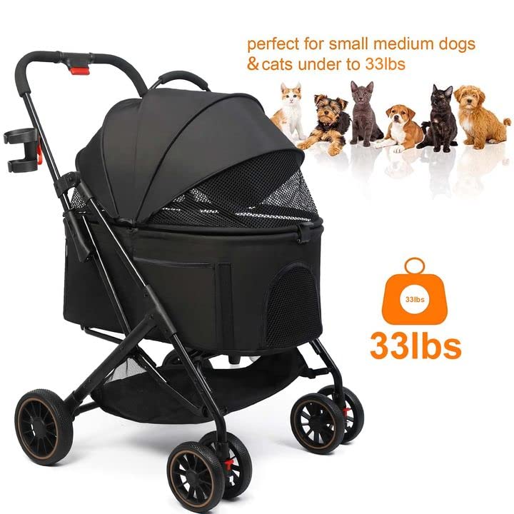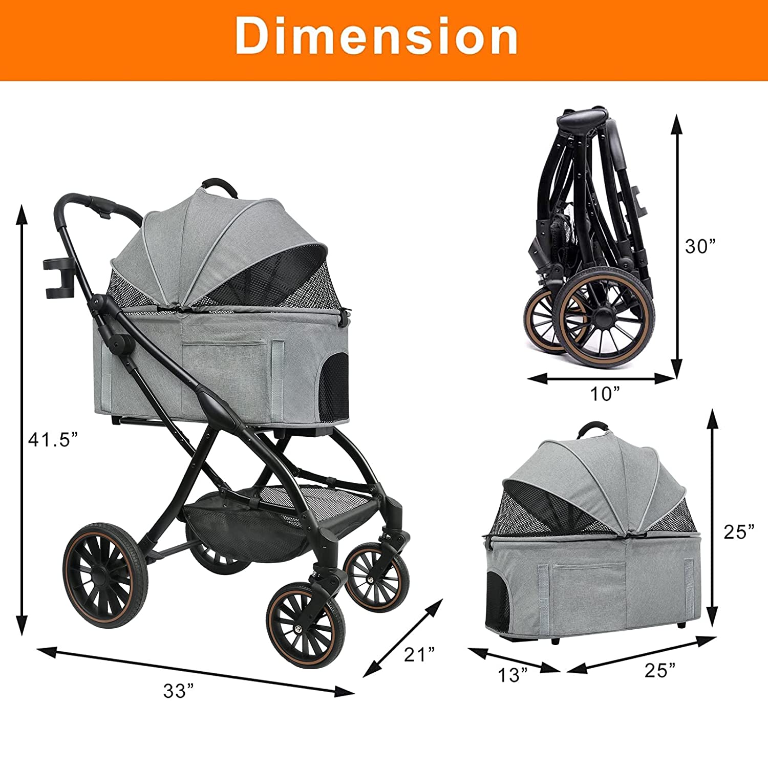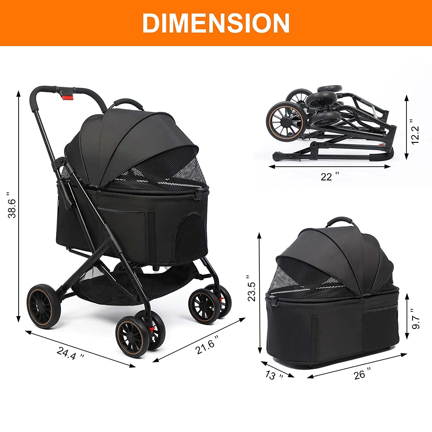 • 【Dog Stroller Dimensions】Our dog stroller for medium dogs size is 24.4"Lx21.6"Wx38.6"H.The size of the dog basket is 26"Lx13" Wx23.5"H.The folding Size is 22"Lx21.6"Wx12.2"H.Weight Capacity: 33 lbs.The size is perfect for small medium dogs and cats.