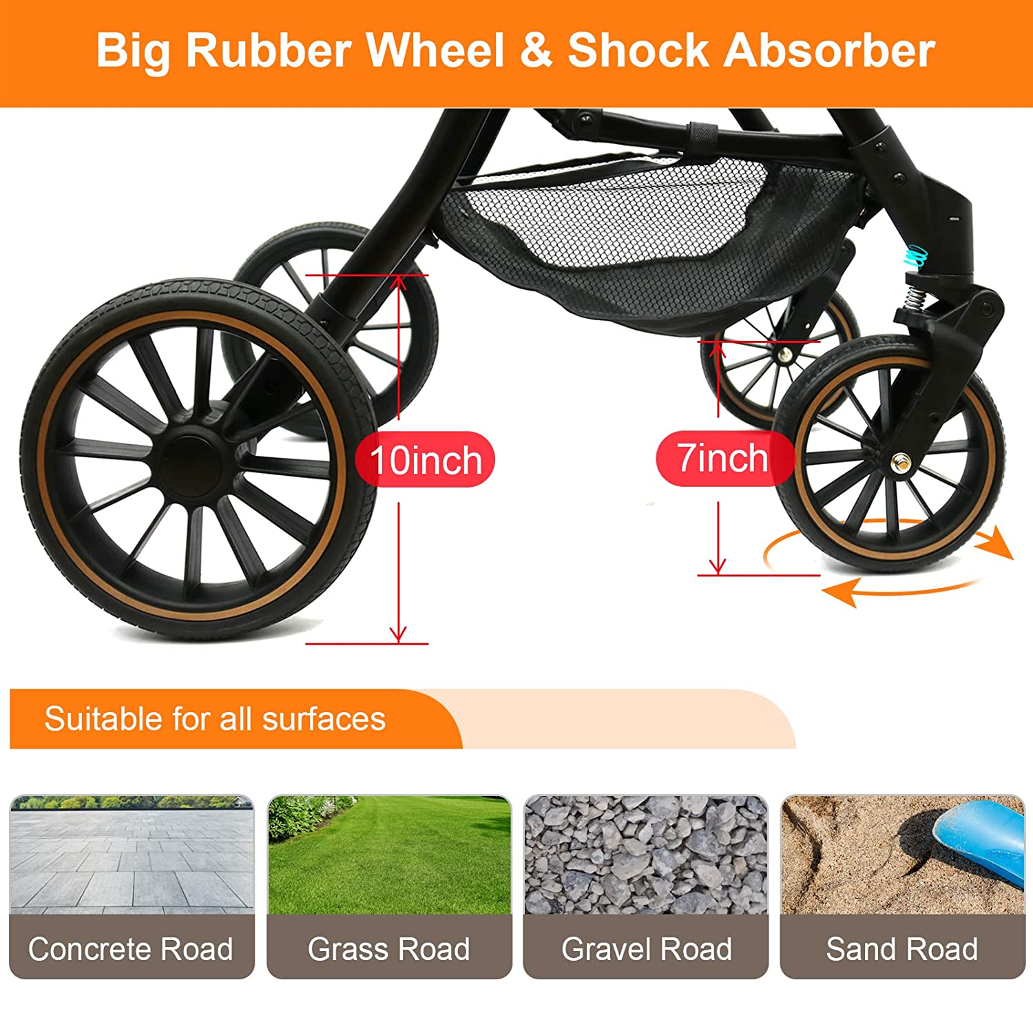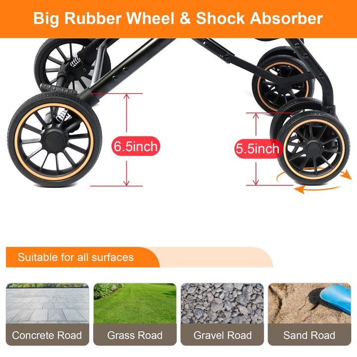 • 【Rubber wheels&Vibration damping】The wheels of our pet strollers are made of PU rubber,wich is more quiet and durable than ordinary plastic wheels.The rear wheel diameter is 6.5 inches with linkage brake,the front wheel size is 5.5 inches with shock absorbers and capable of 360 degree rotation,adapt to a variety of road conditions,in the grass, asphalt, gravel roads can drive very smoothly,so that your pet has a better ride experience.