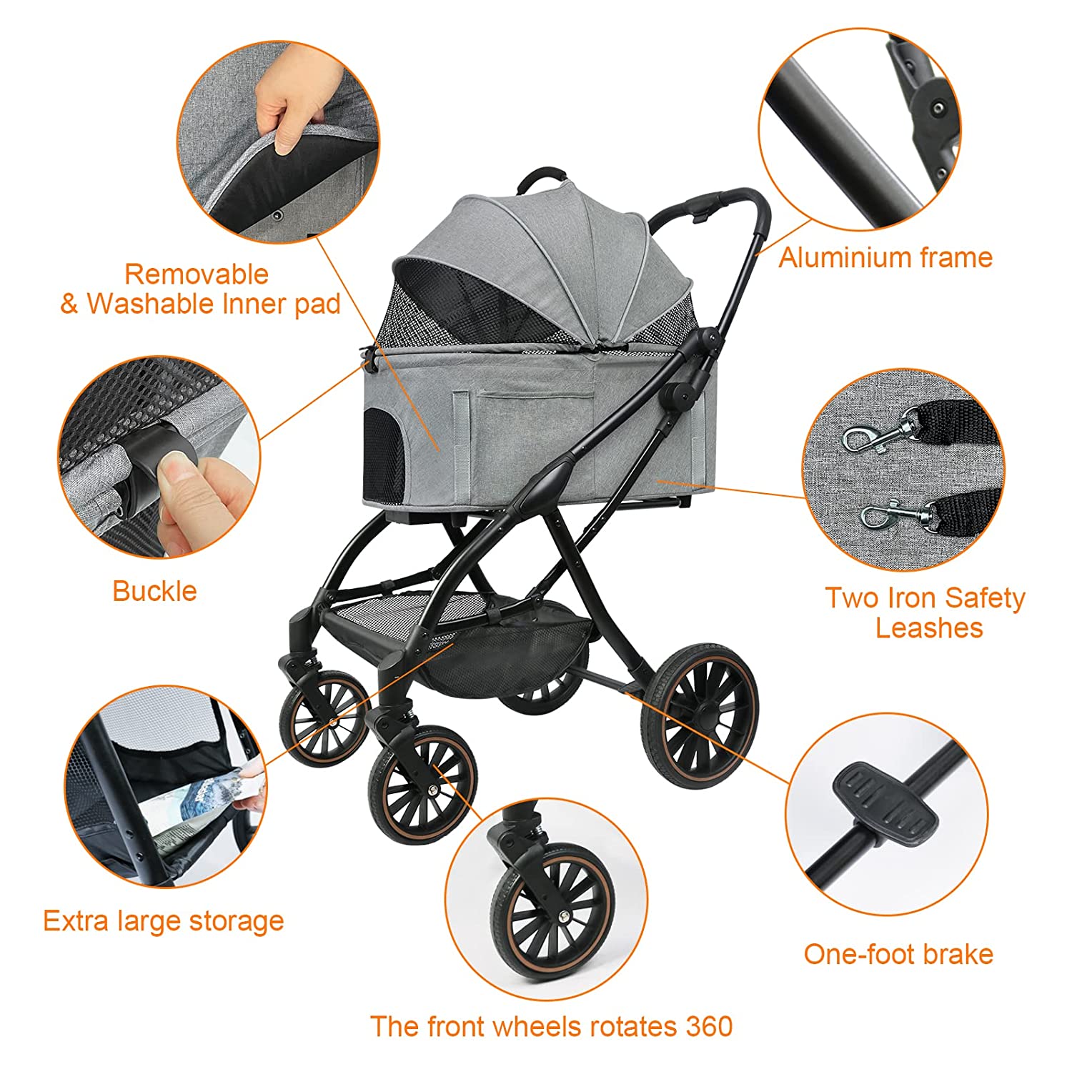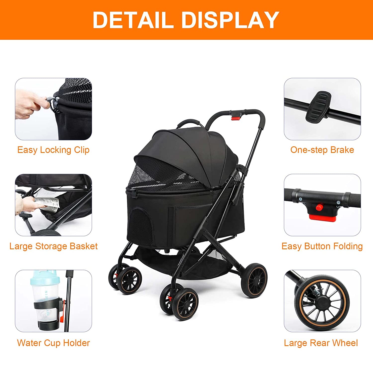 • 【No zipper&Multi-window】Our dog stroller features multiple easy locking latch no zipper mesh doors and windows,and adjustable canopy,allowing this pet stroller to have good air circulation and better visibility.The dog stroller has plenty of space and ventilation,so your pet can enjoy the view and get plenty of fresh air when you take your dog on a trip in the park,walking around the block, or even shopping at the mall.This is the best gift for a pet who loves to walk but can't walk too long.