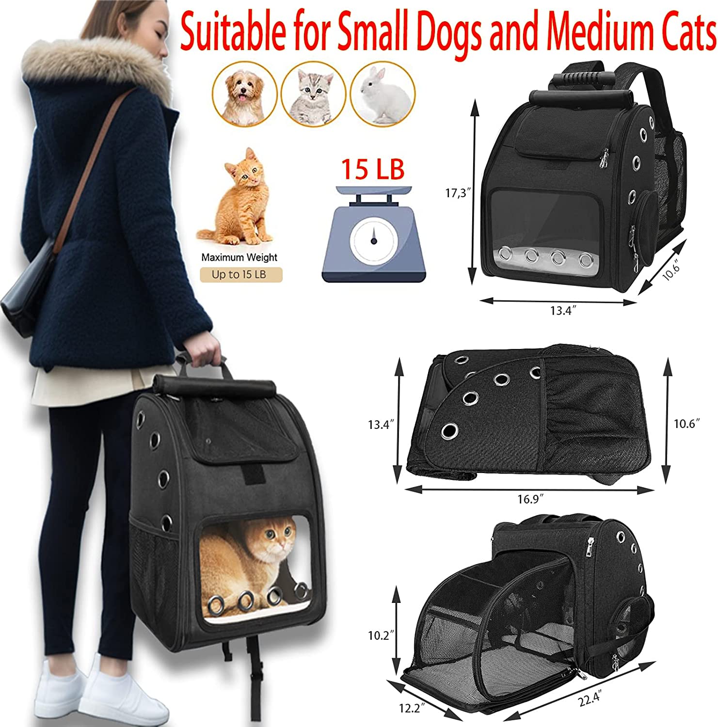 • FIT FOR MOST SMALL AND MEDIUM-SIZED PETS: the size of the kitty puppy carrier is 17.3 x 13.4 x 10.6 Inches (H x W X L), and the expanded size is 17.3 x 22.4 x 10.6 Inches (H x W X L), which is suitable for most small and medium-sized pets. The recommended maximum weight is 15 pounds. Please measure the pet's length (front foot to bottom of tail) and height (floor to top of head) before purchasing.