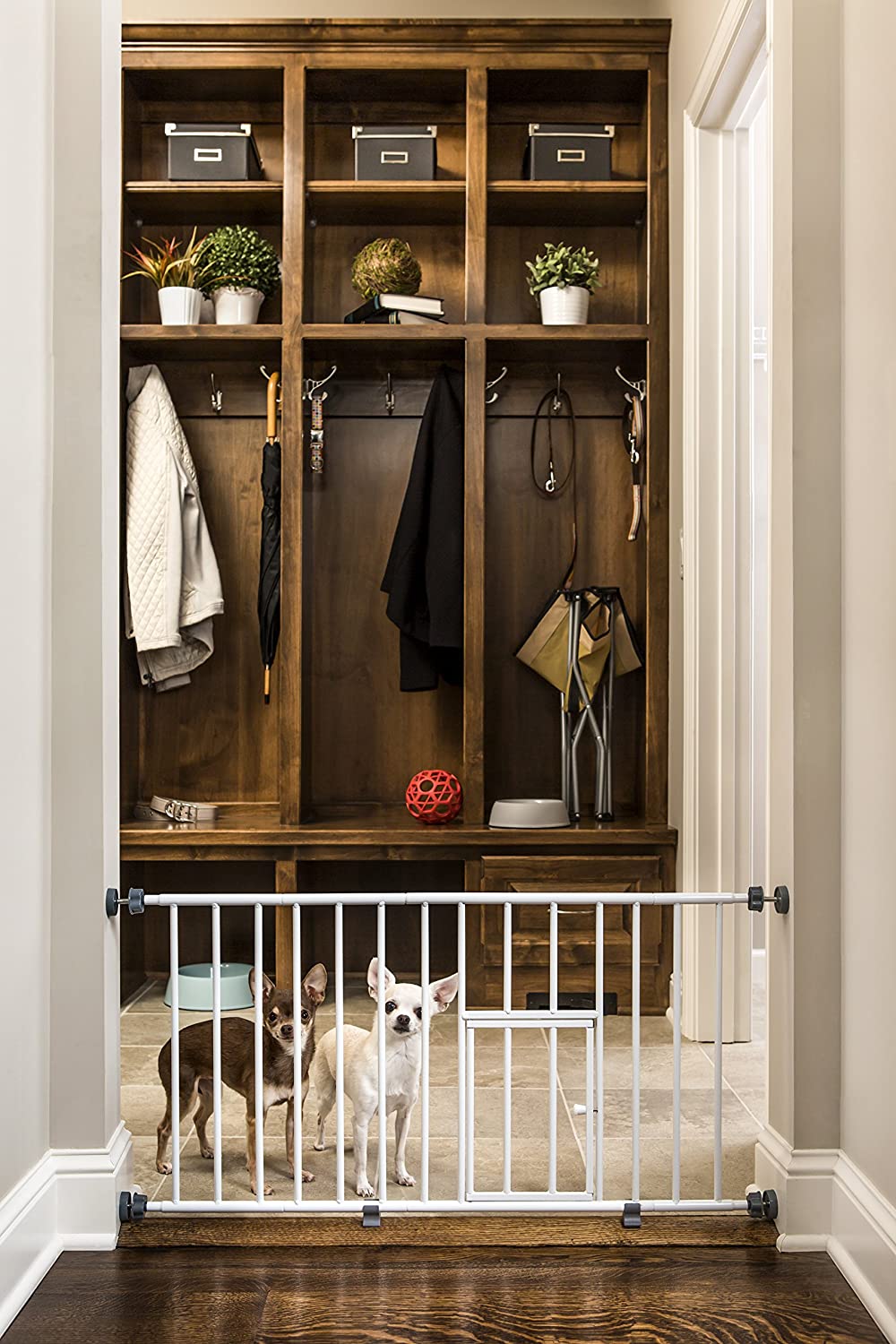 An essential tool for homes with pets, the Carlson Mini Pet Gate is a convenient, chew-proof way to contain and protect both your pet and your home. At just 18 inches high, this is an ideal gate for small dog breeds and puppies. The gate is designed with a pressure-mount system for easy installation and, with the included 4-inch extension, covers openings 18 to 31 inches wide. Small pets can pass through the 8-by-8-inch door opening, while you can comfortably step over the short gate. Made of steel, this pet gate is durable, lead free, and nontoxic. Spacing between the bars is 1.5 inches