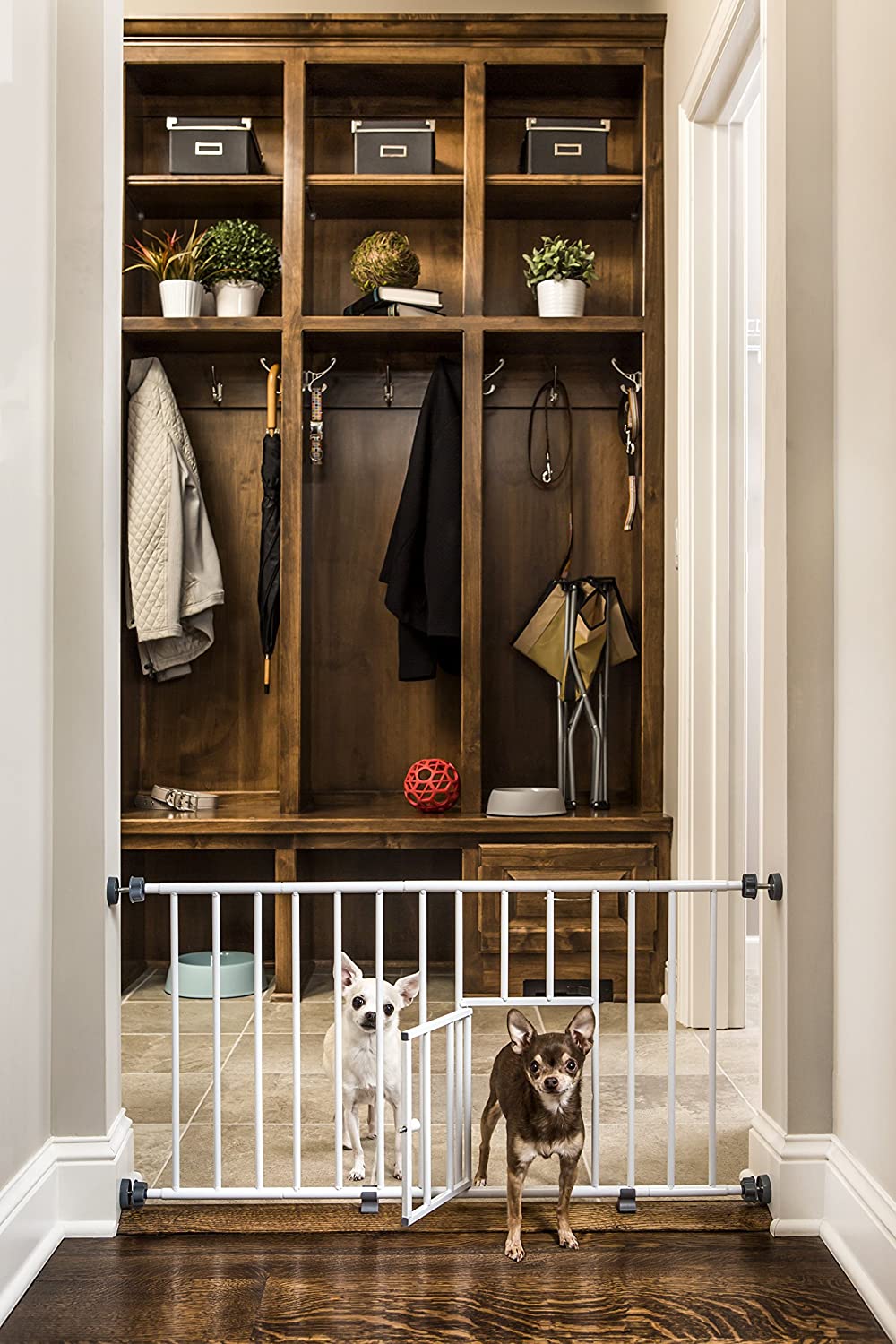 The Carlson Tuffy is an amazingly versatile expandable pet gate with patented small pet door. This all-metal expandable is the first of it’s kind. Expanding 22-38-inch wide and stands a convenient 24-inch tall. The metal frame is strong, sturdy, and durable making this gate extra secure and superior to plastic. Super easy to install, takes literally seconds. Pressure mounts and locks with the patented Easy Fit Locking System. Soft rubber bumpers are gentle on walls and keeps them scuff free. The lightweight compact design is great for travel and storage. Slate size is 1.75-inch wide. To set the gate, grab both sides and expand to the desire width, lift the locking pin, moving it into place and securing it in the open hole. Now just twist the plastic knob to adjust the pressure until the gate is safely secured against the wall.