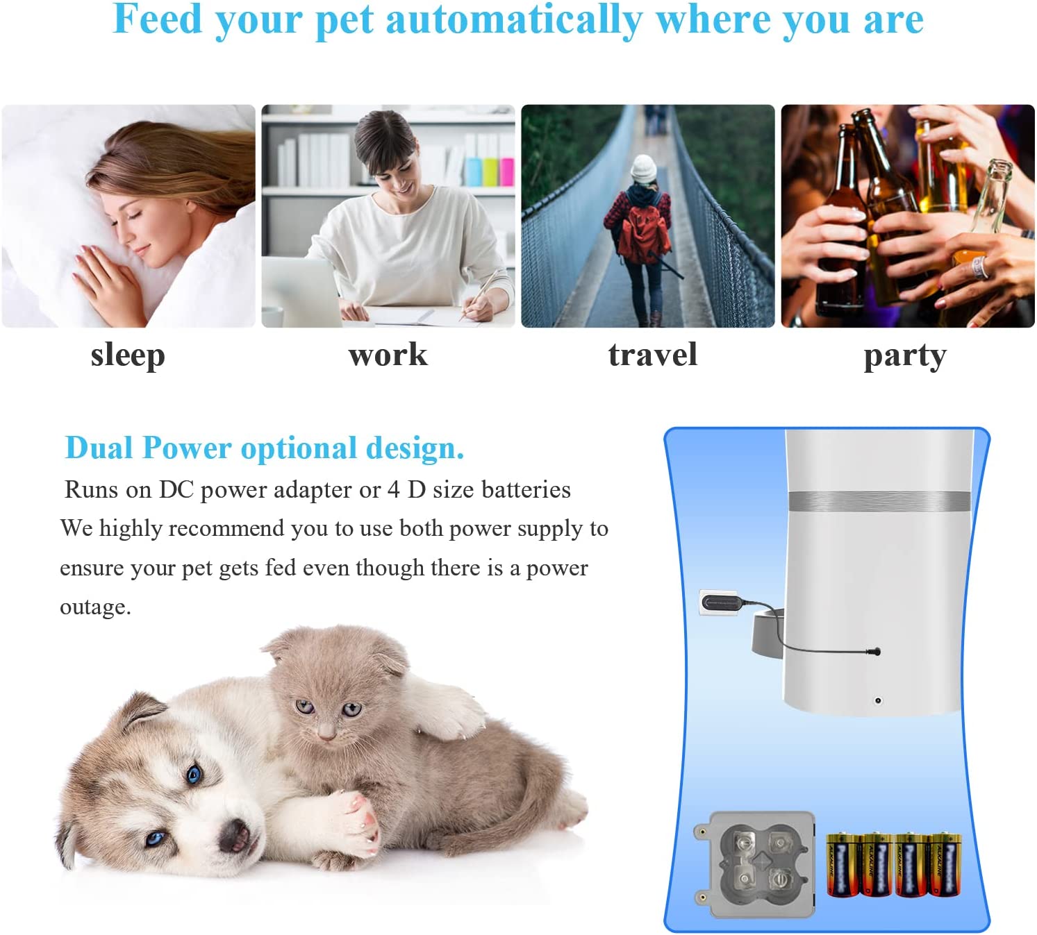 • 【Never Miss A Feeding】- The WellToBe automatic cat feeder is powered by a power adapter and 4 D alkaline size batteries. In case of a power outage, the feeder will continue to function on batteries to assure your pet never miss a feeding (Batteries are NOT included). The Food storage capacity is 13 cups for dry food can satisfy with one large adult dog 5 days and one adult cat 1 months feeding demand, perfect for pet parents with a very busy schedule or singles who travel for days at a time.