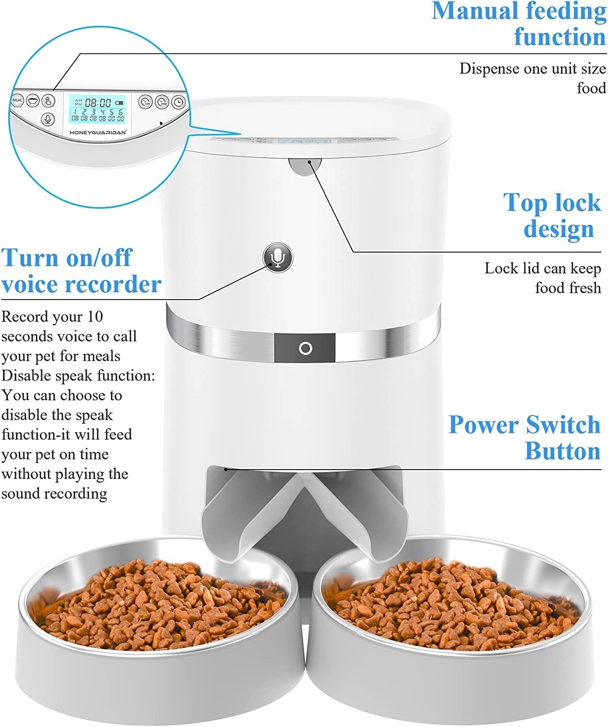 Automatic Cat Feeder, WellToBe Pet Feeder Food Dispenser for Cat & Small Dog with Two-Way Splitter and Double Bowls, up to 6 Meals with Portion Control, Voice Recorder - Battery and Plug-in Power